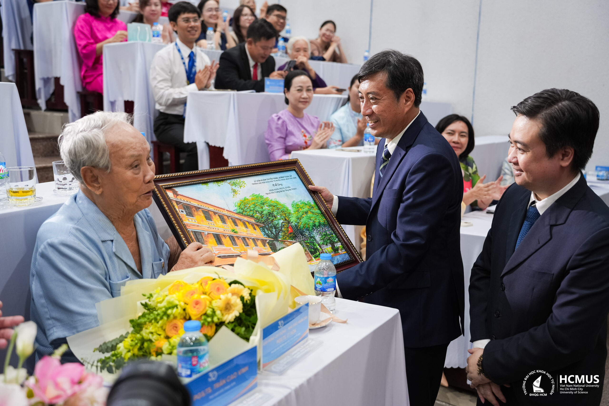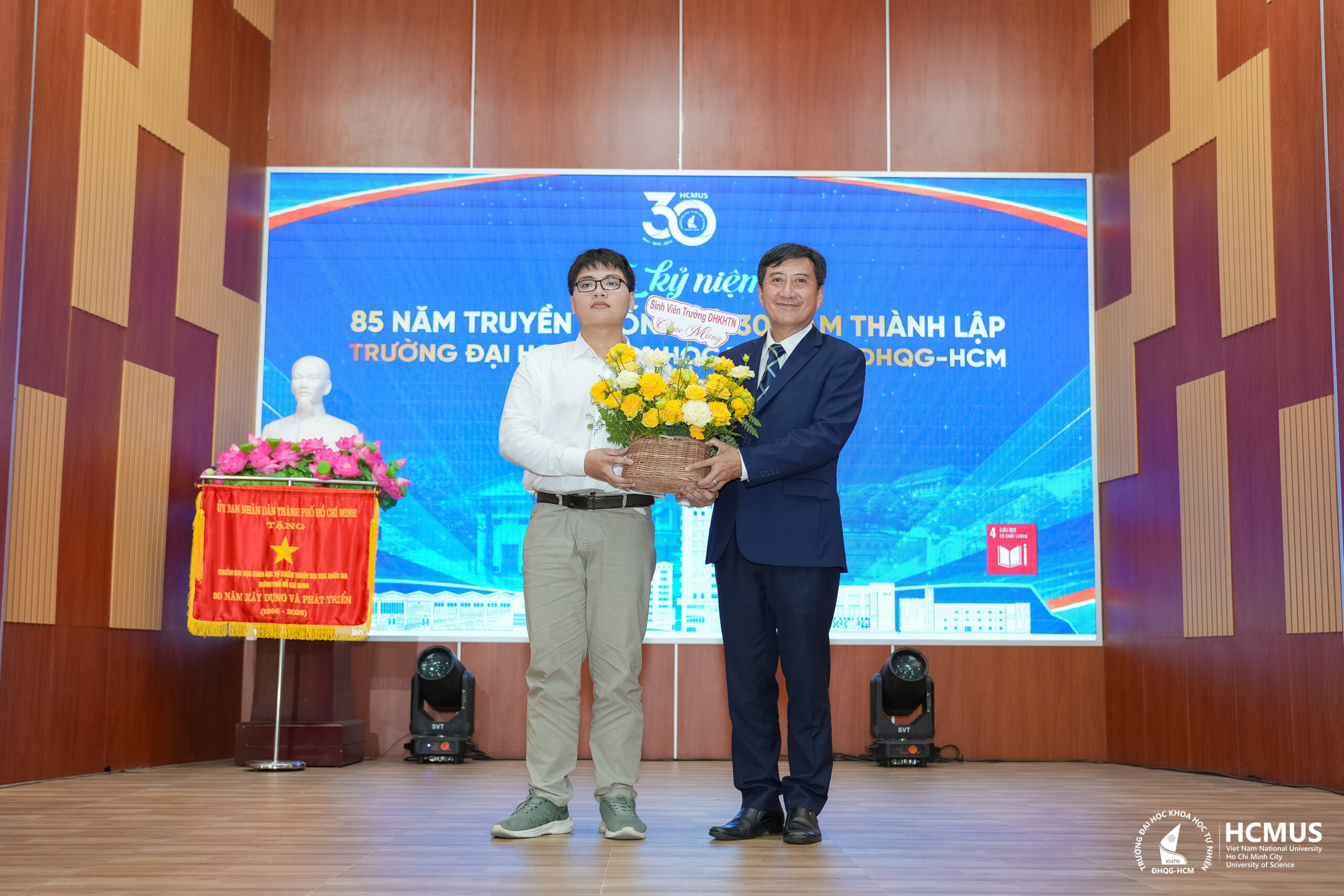 Lê Kiến Thành – Gương mặt trẻ Việt Nam tiêu biểu 2025, sinh viên năm nhất ngành Khoa học máy tính (chương trình tiên tiến), Khoa Công nghệ thông tin – đại diện người học tặng hoa cho lãnh đạo Nhà trường chúc mừng Trường Đại học Khoa học tự nhiên, ĐHQG-HCM kỷ niệm 85 năm truyền thống và 30 năm thành lập.