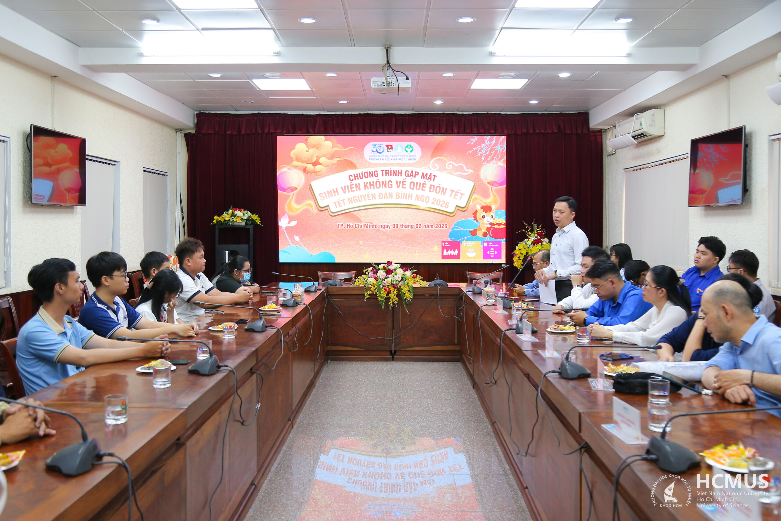 Sáng ngày 09/02 (tức 22 tháng Chạp), tại cơ sở Nguyễn Văn Cừ, Trường Đại học Khoa học tự nhiên, ĐHQG-HCM đã tổ chức chương trình gặp gỡ, động viên và tặng quà cho sinh viên không về quê đón Tết Nguyên đán Bính Ngọ 2026.  Chương trình có sự tham dự của Ban Giám hiệu Nhà trường, lãnh đạo các phòng, ban, khoa cùng các sinh viên sẽ ở lại Thành phố Hồ Chí Minh trong dịp Tết.