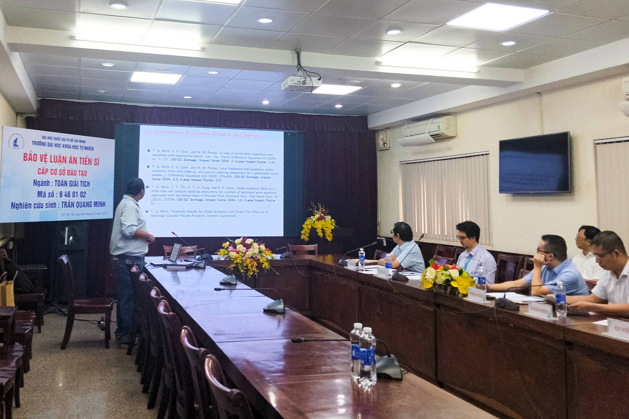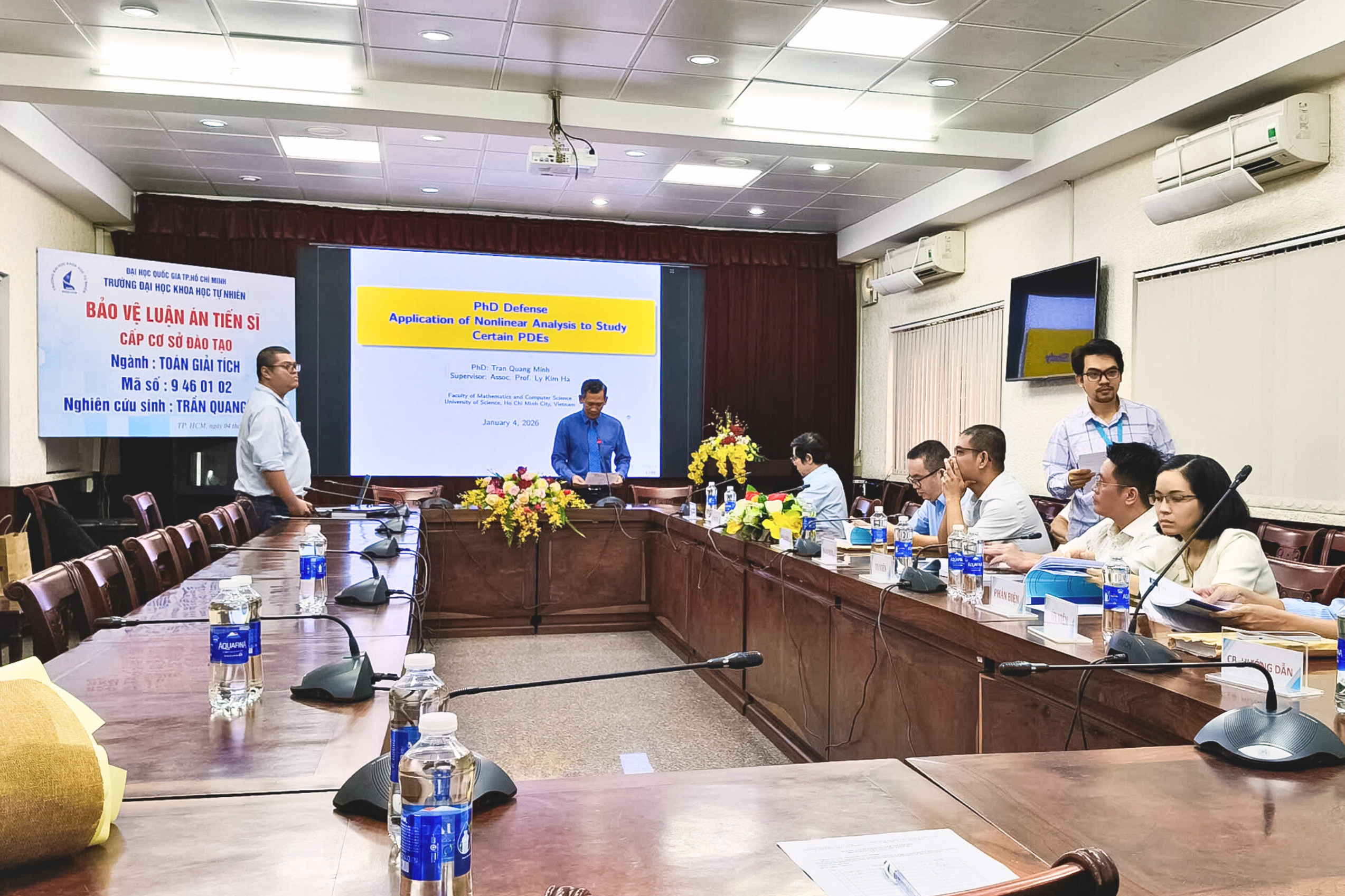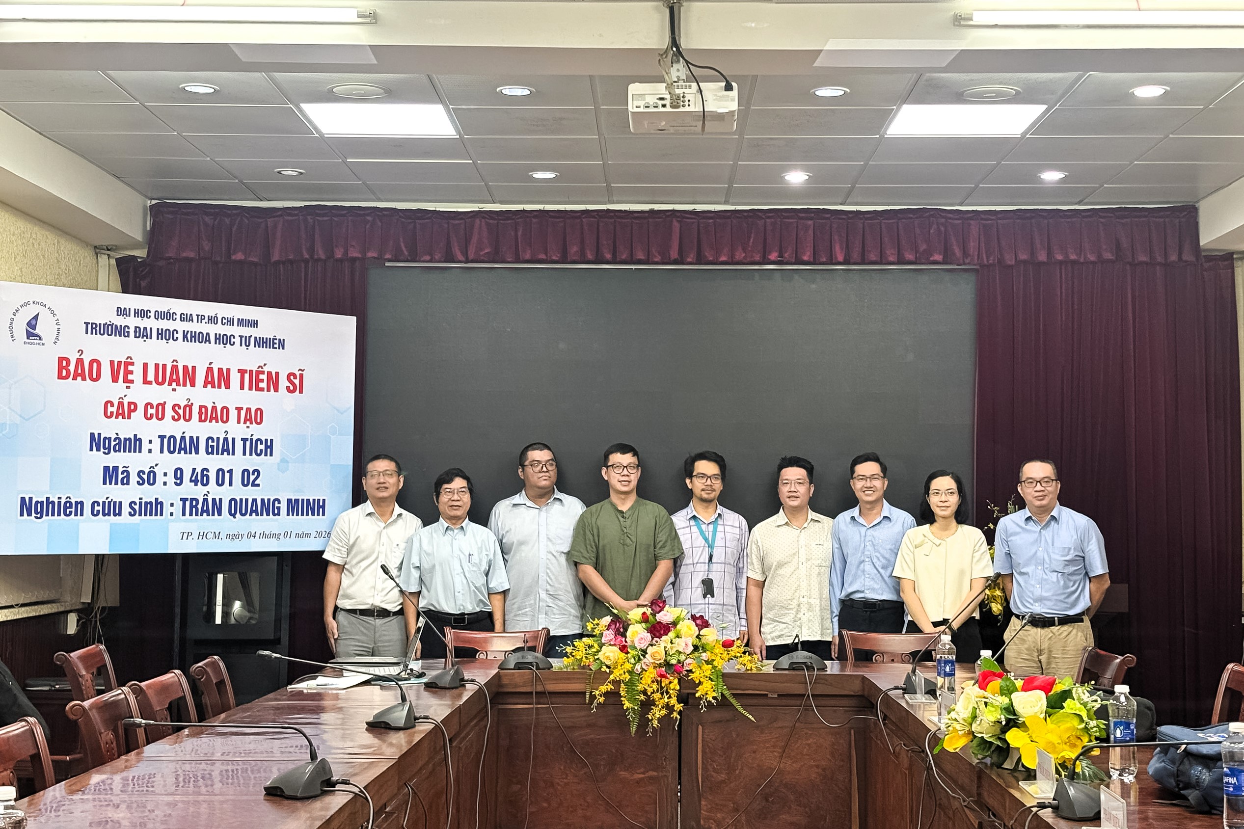 Ngày 4/1/2026, tại cơ sở Nguyễn Văn Cừ, Trường Đại học Khoa học tự nhiên, ĐHQG-HCM đã diễn ra buổi bảo vệ luận án tiến sĩ cấp cơ sở đào tạo của nghiên cứu sinh Trần Quang Minh, chuyên ngành Toán Giải tích Khóa 2022 dưới sự hướng dẫn khoa học của PGS. TS. Lý Kim Hà.