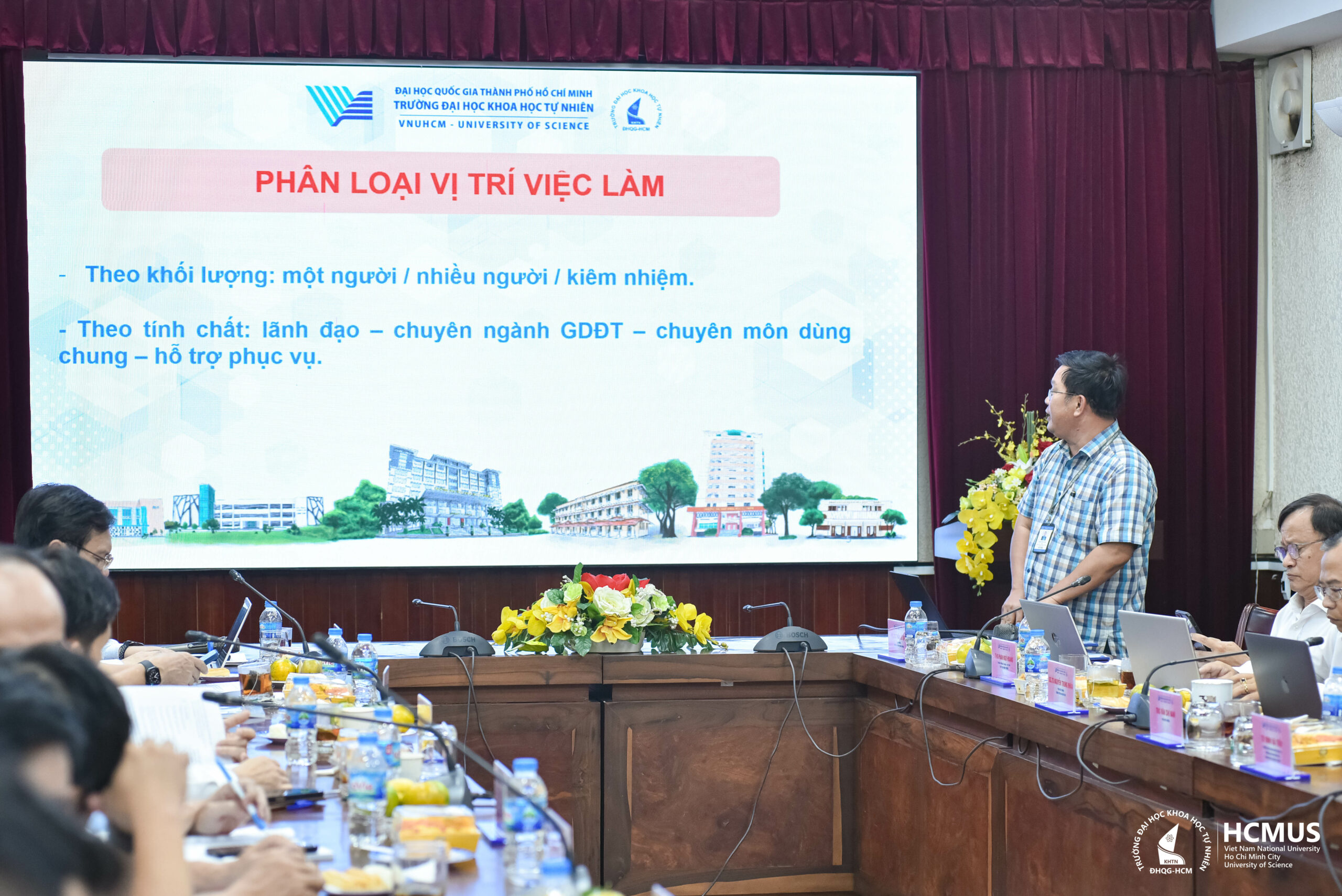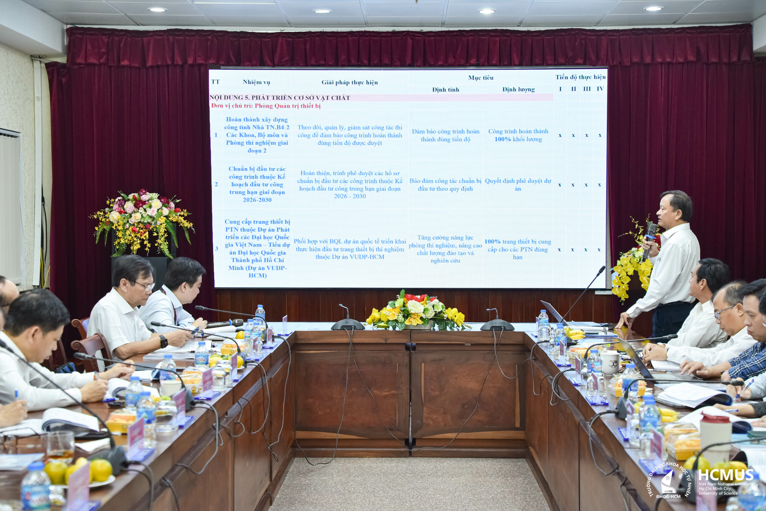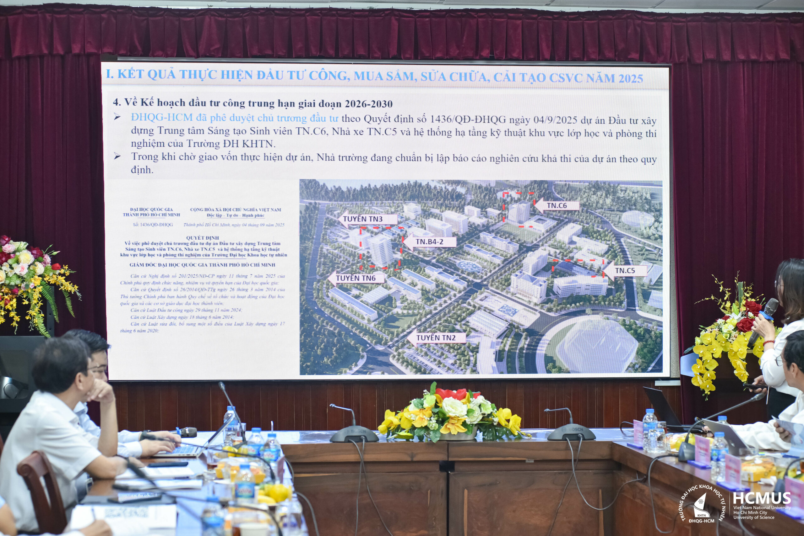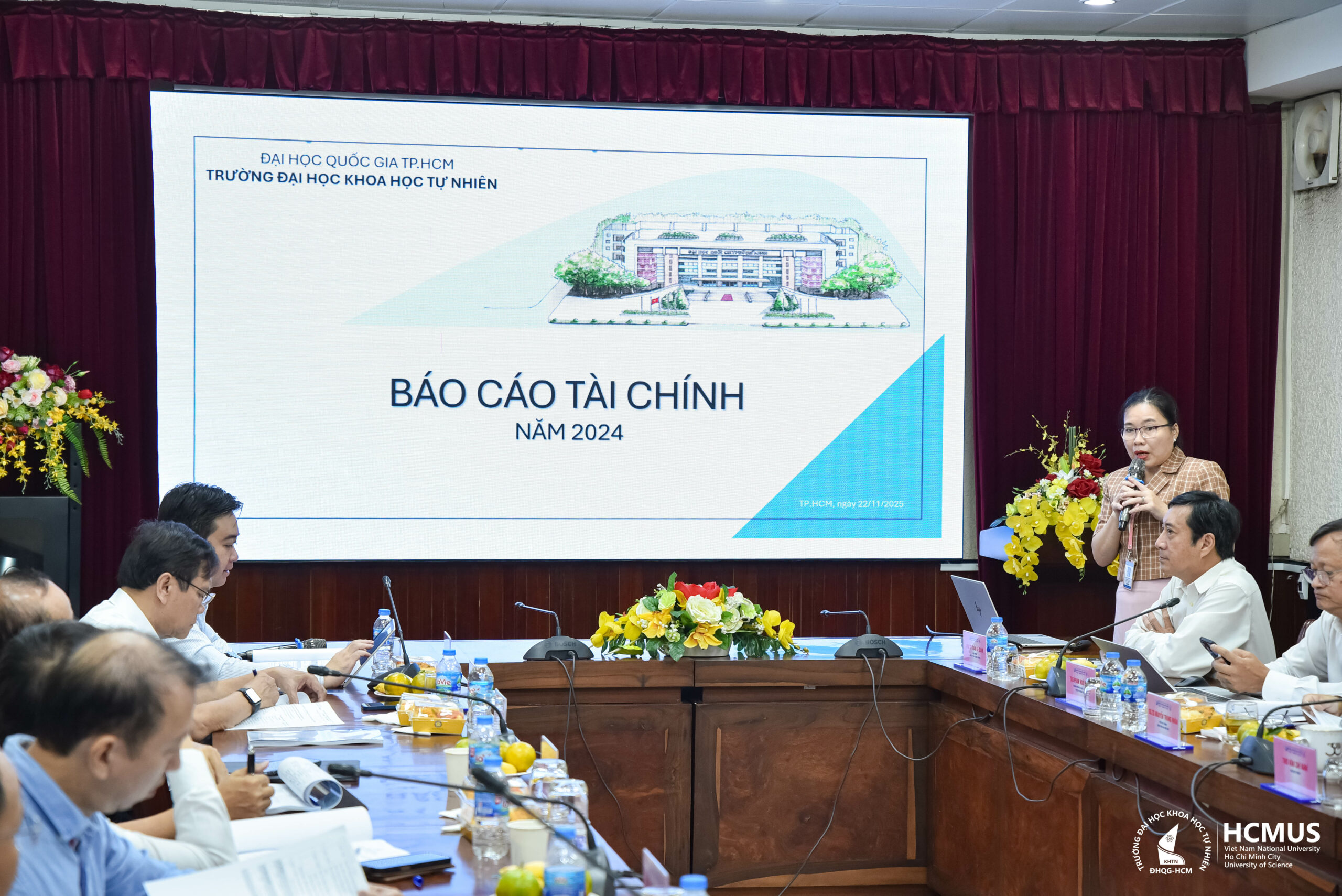 Tại Hội nghị, Thành viên Hội đồng trường và Khách mời được nghe các báo cáo về: (1) Báo cáo Kết quả thực hiện Nhiệm vụ trọng tâm năm 2025 năm 2025; (2) Dự thảo Nhiệm vụ trọng tâm năm 2026; (3) Chiến lược phát triển Trường Đại học Khoa học tự nhiên, giai đoạn 2021-2030, tầm nhìn 2045; (4) Báo cáo quyết toán tài chính năm 2024; (5) Kết quả công tác triển khai thực hiện đầu tư công, mua sắm, sửa chữa, cải tạo cơ sở vật chất năm 2025; (6) Báo cáo Công tác thực hiện sắp xếp tổ chức bộ máy, nhân sự công tác tại nhà trường theo tinh thần chỉ đạo Nghị quyết 18; (7) Đề án vị trí việc làm giai đoạn 2025-2030; (8) Báo cáo Đánh giá kết quả thực hiện nhiệm vụ năm 2025 của Phó Chủ tịch phụ trách Hội đồng trường và Hiệu trưởng.