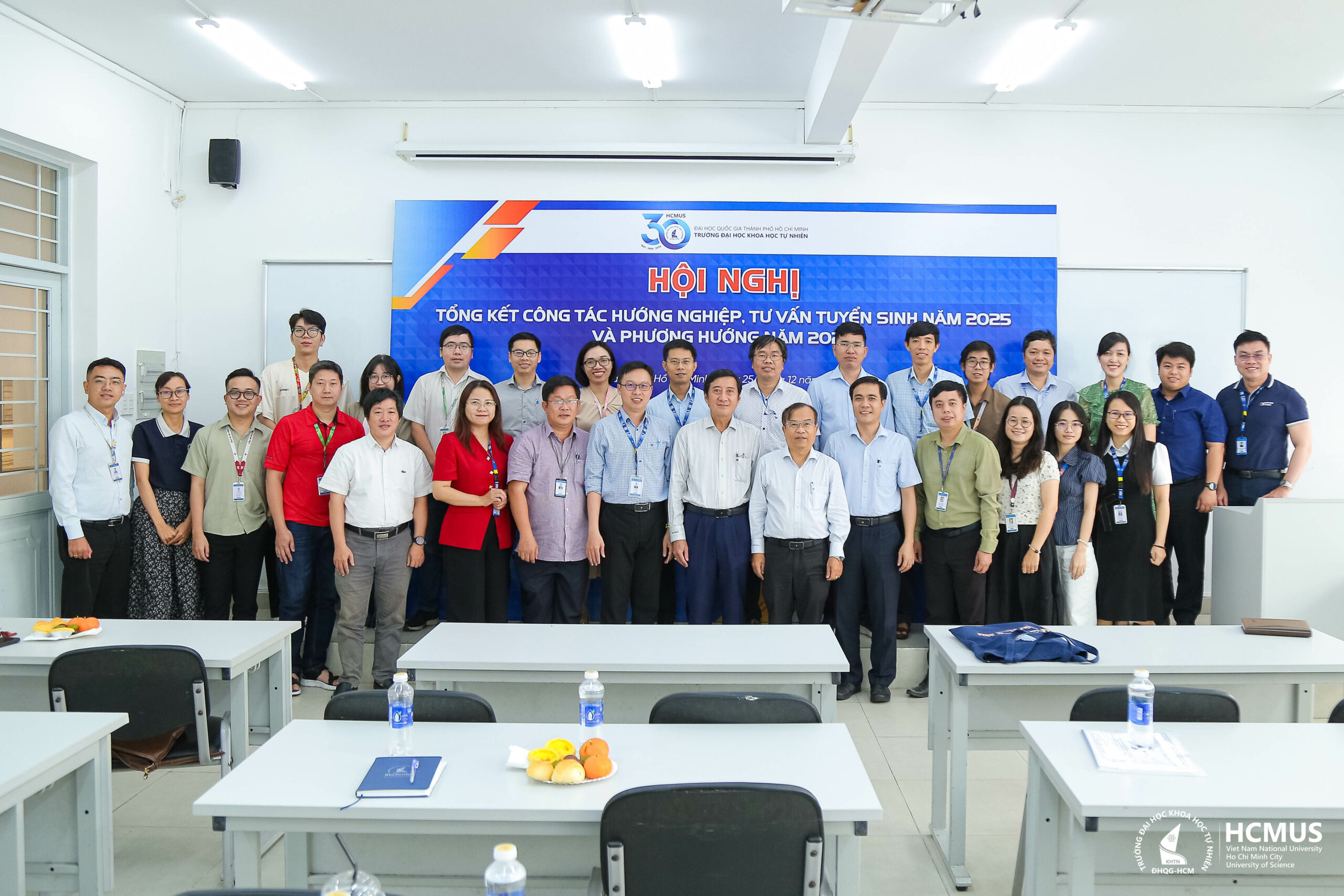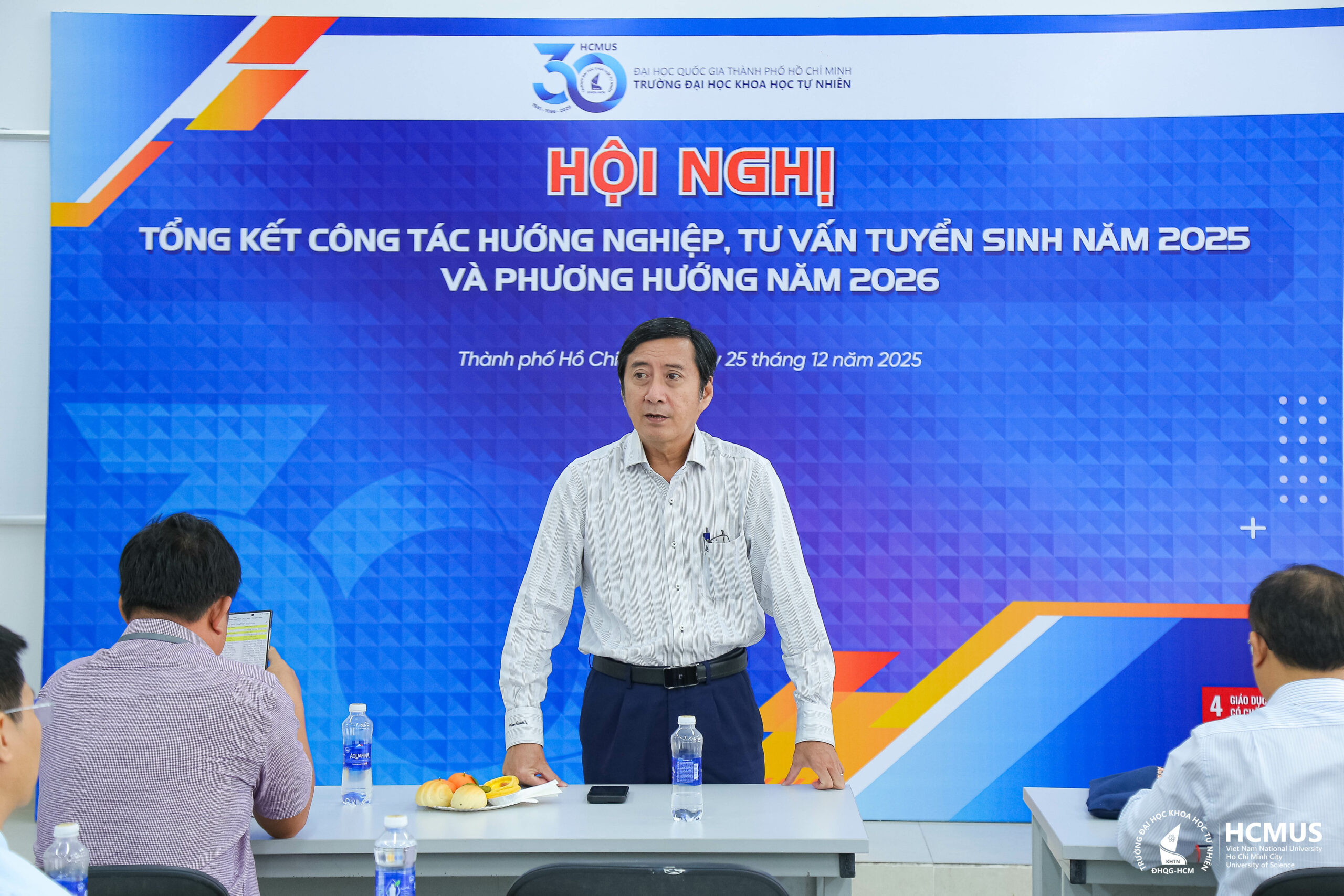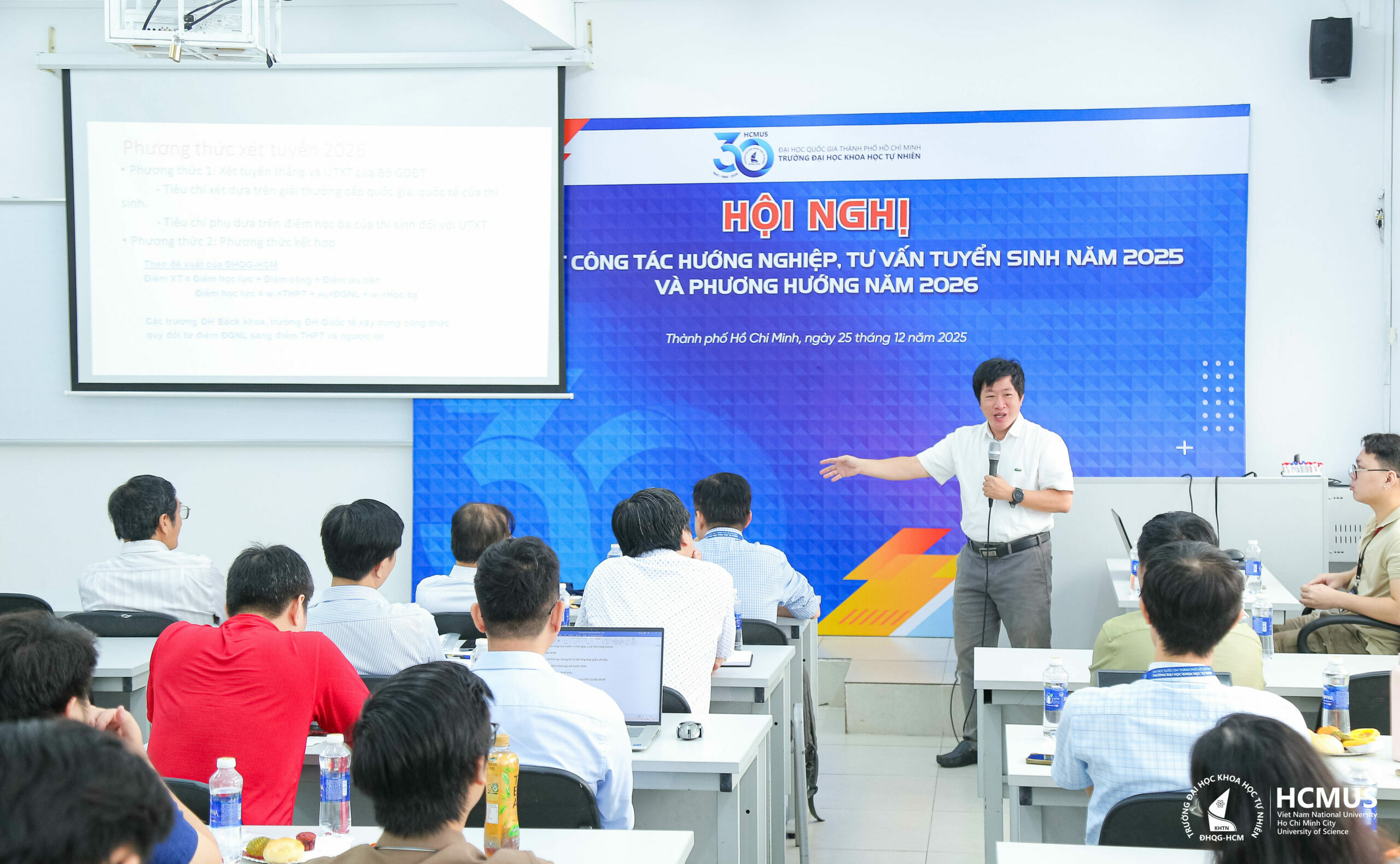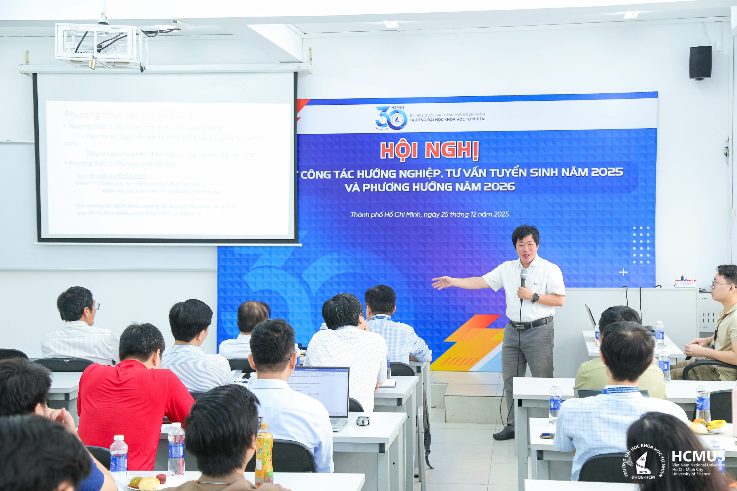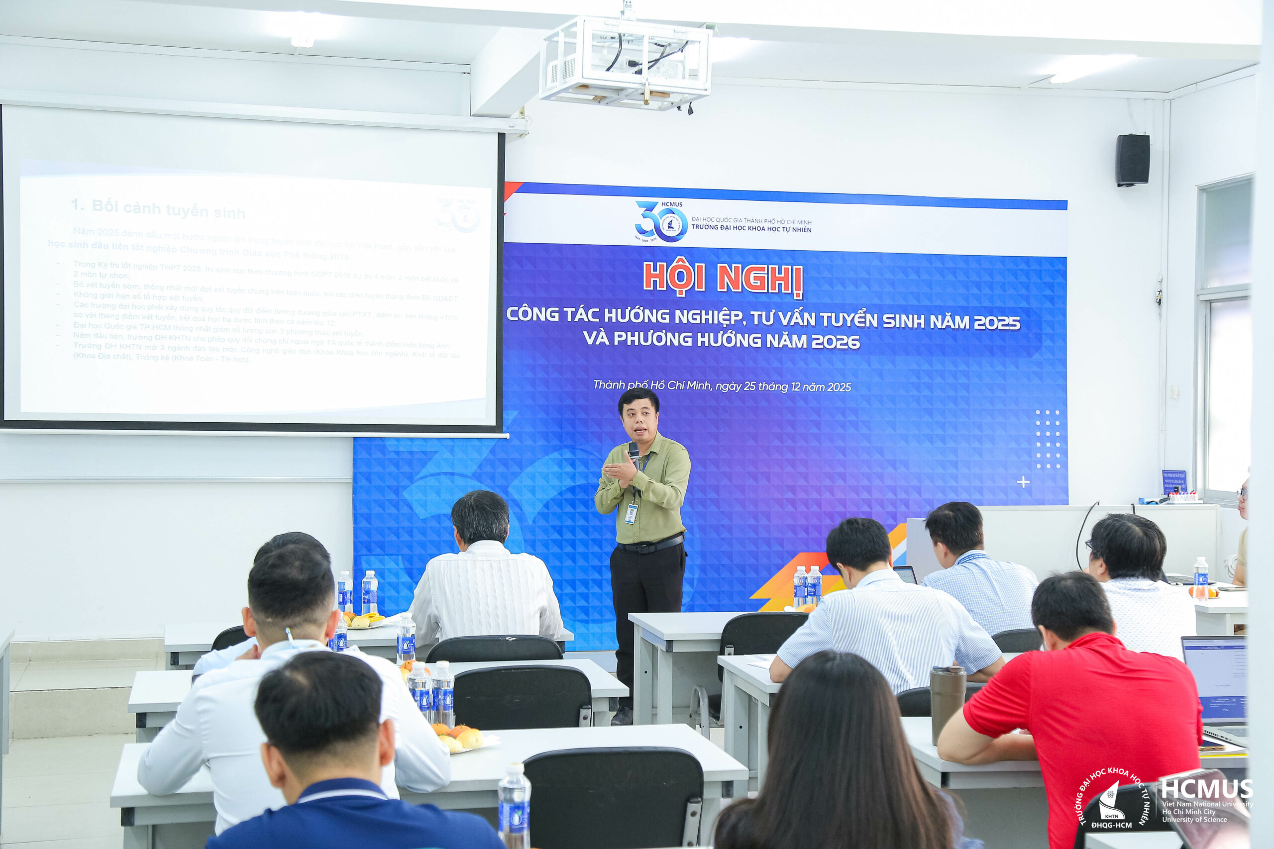Sáng ngày 25/12, tại cơ sở Nguyễn Văn Cừ, Trường Đại học Khoa học tự nhiên, ĐHQG-HCM đã tổ chức Hội nghị Tổng kết công tác Hướng nghiệp và Tư vấn tuyển sinh năm 2025, đồng thời trao đổi phương hướng triển khai cho năm 2026. Hội nghị do Phòng Thông tin – Truyền thông phối hợp với Phòng Đào tạo tổ chức, dưới sự chỉ đạo của Ban Giám hiệu Nhà trường.
