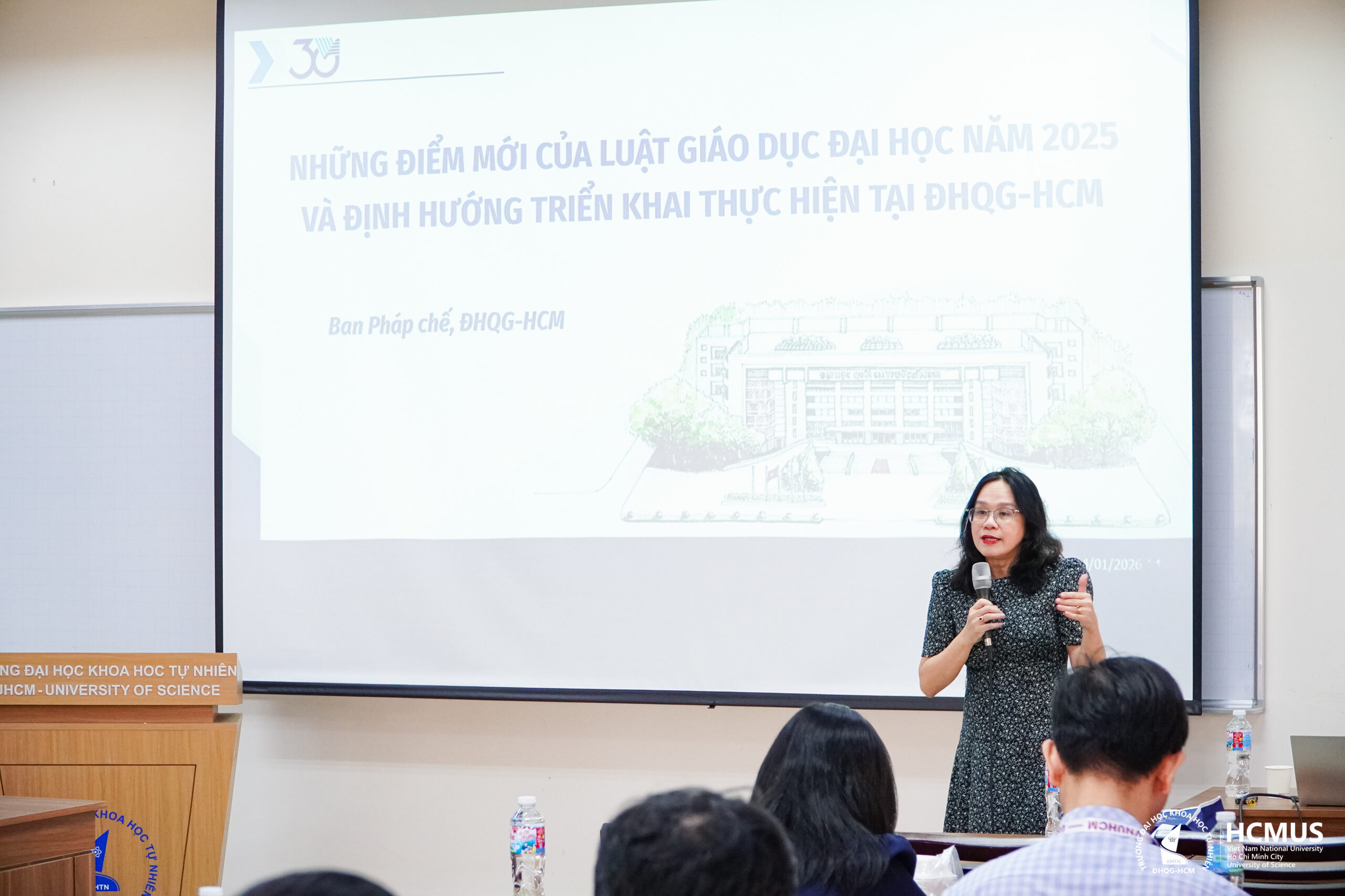 Tại hội thảo, PGS.TS Thái Thị Tuyết Dung, Trưởng ban Ban Pháp chế, ĐHQG-HCM đã trình bày báo cáo về những điểm mới của Luật Giáo dục đại học năm 2025 và một số văn bản pháp lý liên quan đến công tác đào tạo. Báo cáo tập trung giới thiệu các nghị quyết, luật và quy định mới có hiệu lực trong thời gian tới, làm rõ các nội dung liên quan đến cơ chế, chính sách phát triển giáo dục đại học, quản lý đào tạo, văn bằng, chứng chỉ, đội ngũ nhà giáo và cơ sở giáo dục đại học. Qua đó, báo cáo giúp các đơn vị đào tạo nắm bắt kịp thời những yêu cầu mới của pháp luật, làm căn cứ để rà soát, điều chỉnh và triển khai hoạt động đào tạo phù hợp với quy định hiện hành.