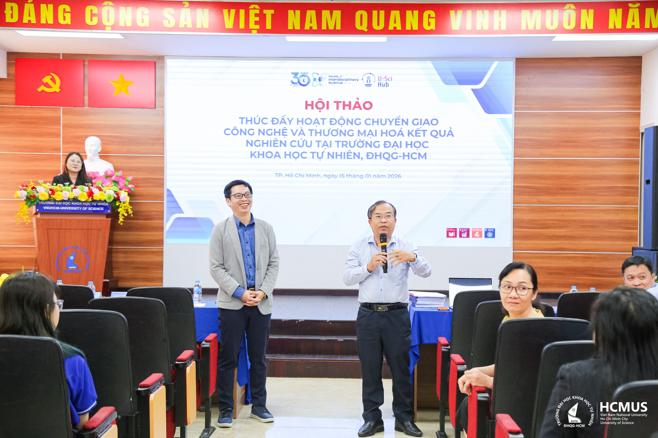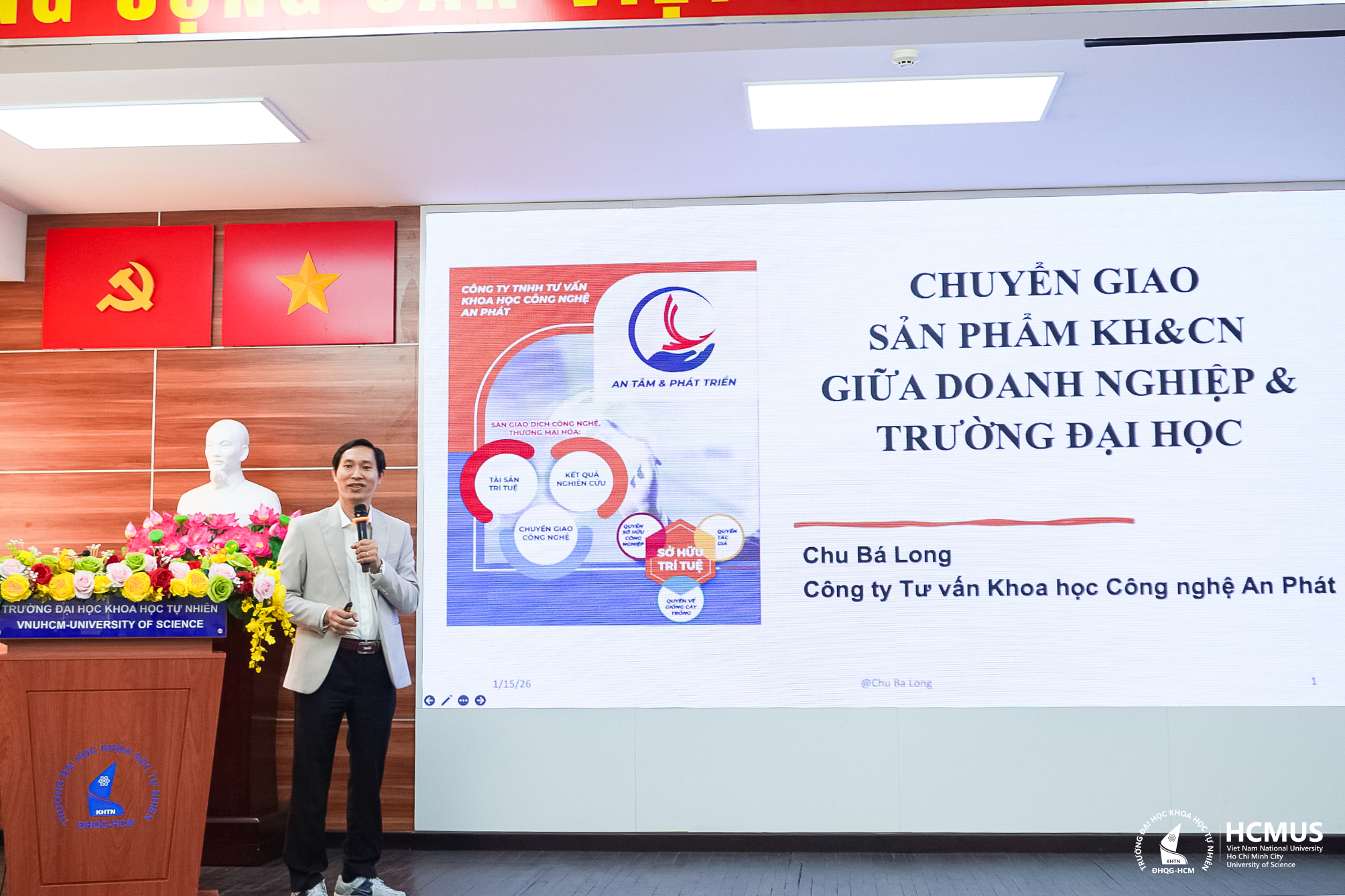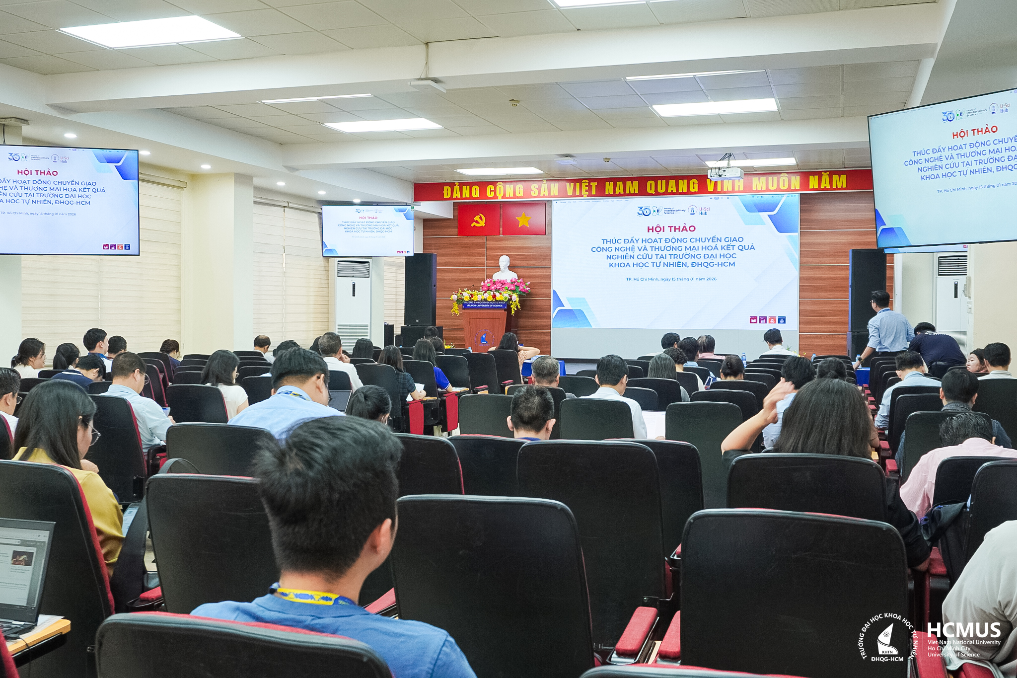 Ngày 15/01/2026, tại cơ sở Nguyễn Văn Cừ, Trường Đại học Khoa học tự nhiên, ĐHQG-HCM đã tổ chức thành công Hội thảo “Thúc đẩy hoạt động chuyển giao công nghệ và thương mại hóa kết quả nghiên cứu tại Trường Đại học Khoa học tự nhiên, Đại học Quốc gia Thành phố Hồ Chí Minh”.