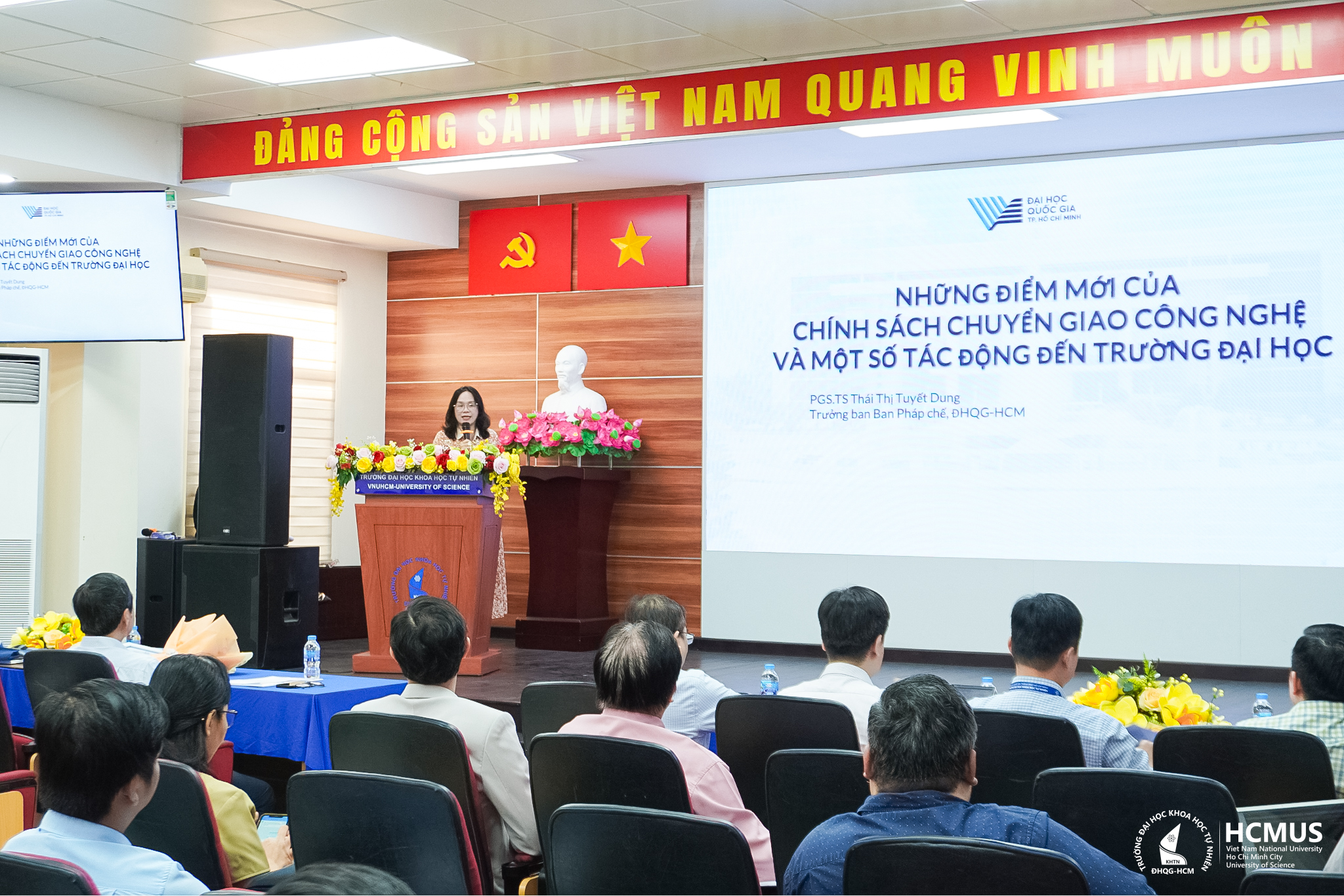 Hội thảo được triển khai với 5 chuyên đề chuyên sâu, cập nhật đồng thời cả cơ sở lý luận và kinh nghiệm thực tiễn trong lĩnh vực chuyển giao công nghệ. Mở đầu, PGS.TS Thái Thị Tuyết Dung – Trưởng ban Pháp chế ĐHQG-HCM đã trình bày tổng quan khung pháp lý và các chính sách mới liên quan đến hoạt động chuyển giao công nghệ trong các cơ sở giáo dục đại học, làm rõ những thuận lợi, thách thức và các cơ chế hỗ trợ hiện hành nhằm thúc đẩy thương mại hóa kết quả nghiên cứu trong bối cảnh đổi mới sáng tạo.