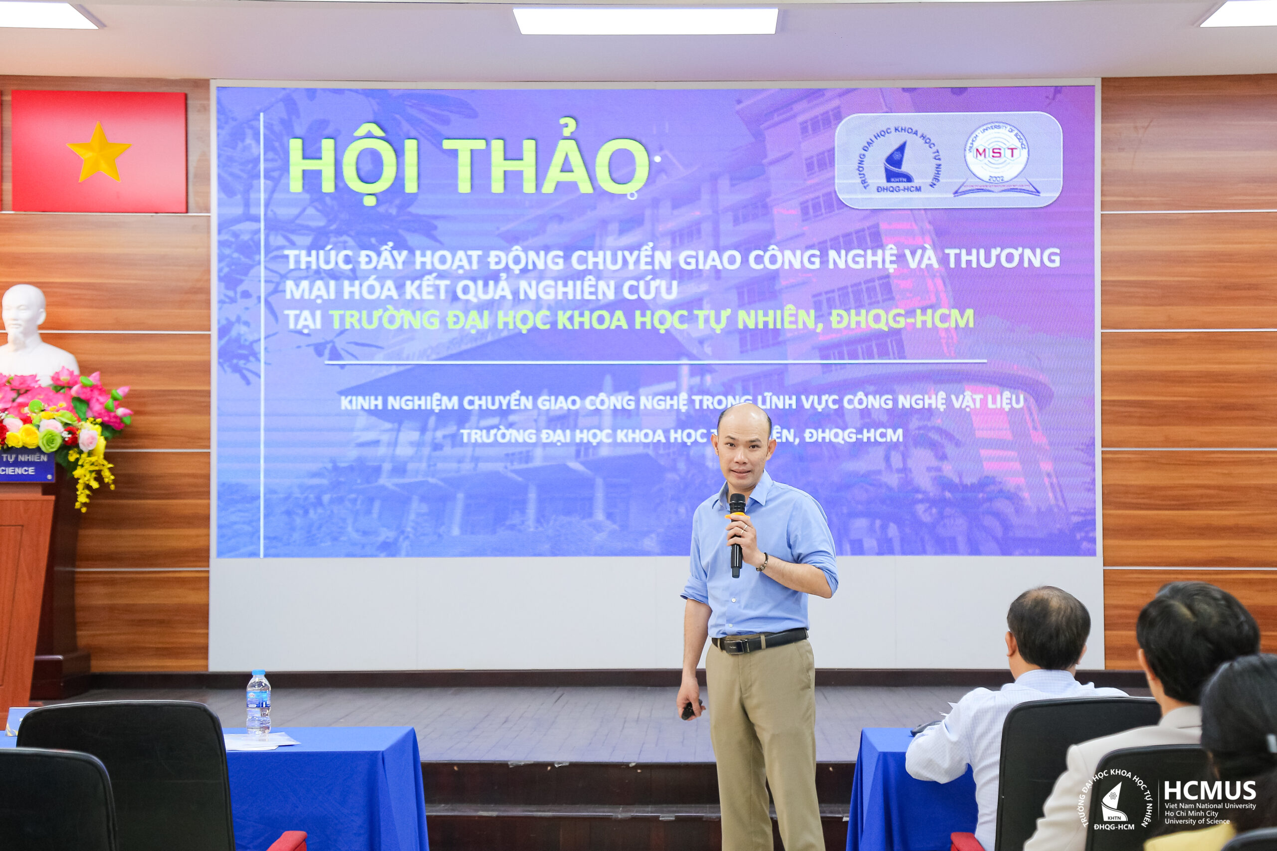 Trong chuyên đề tiếp theo, PGS.TS Hà Thúc Chí Nhân – Phó Trưởng khoa Khoa Khoa học và Công nghệ vật liệu, Trường Đại học Khoa học tự nhiên, ĐHQG-HCM trình bày kinh nghiệm triển khai hoạt động chuyển giao công nghệ tại Trường với nhiều mô hình hợp tác hiệu quả. Báo cáo đã giới thiệu các trường hợp điển hình, minh chứng cho tiềm năng nghiên cứu và năng lực ứng dụng của đội ngũ khoa học trong Nhà trường.