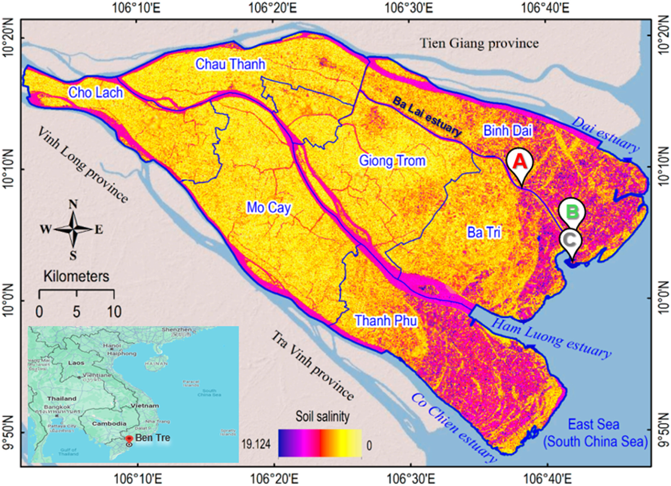 Salinity distribution map of the Mekong River in Ben Tre province (S‰). Sampling locations (A), (B), and (C) are situated 15, 5, and 1 km inland from the sea, respectively.
