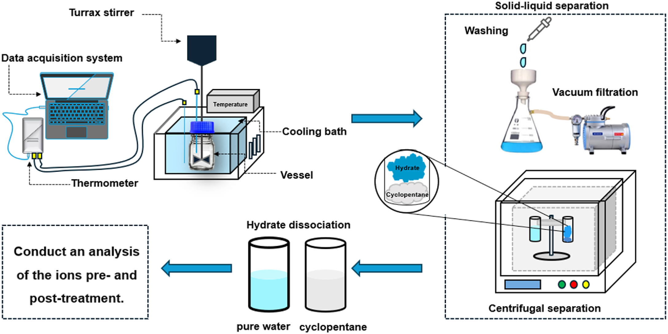 Freshwater scarcity is a critical issue in Vietnam, particularly in the Mekong Delta, a densely populated region with an agriculture-based economy. This scarcity is largely driven by saltwater intrusion during the dry season, severely affecting both agriculture and the local economy. In response, advanced desalination technologies have been proposed. In this study, we investigated the use of cyclopentane (CP), a liquid guest molecule, and 1,1,1,2-tetrafluoroethane (R134a), a gaseous guest molecule, as hydrate formers to desalinate saline water from the Mekong Delta. This study aimed to evaluate and compare the freshwater recovery efficiencies of these hydrate formers and assess the potential of hydrate technology for practical application in the region. We performed thermodynamic and kinetic investigations on sodium chloride solutions (1.0–3.5 wt%), representing the salinity levels of seawater in the Mekong Delta, to establish a laboratory-scale desalination system. The results showed a consistent thermodynamic trend: the higher concentration of samples leads to the longer time of hydrate formation to achieve the conversion of water into hydrates exceeding 60 %. Additionally, the CP and R134a hydrate structures were characterized using Raman spectroscopy, which revealed significant changes in the water peak and C–H band signal during the hydrate formation process. After a single-stage hydrate treatment using CP and R134a, the removal efficiencies for ions and total dissolved solids in saline water samples from the Mekong Delta exceeded 75 % and 70 %, respectively. These findings serve as a reference for developing a larger-scale hydrate-based desalination technology to address the challenges of saltwater intrusion in the Mekong Delta region.
