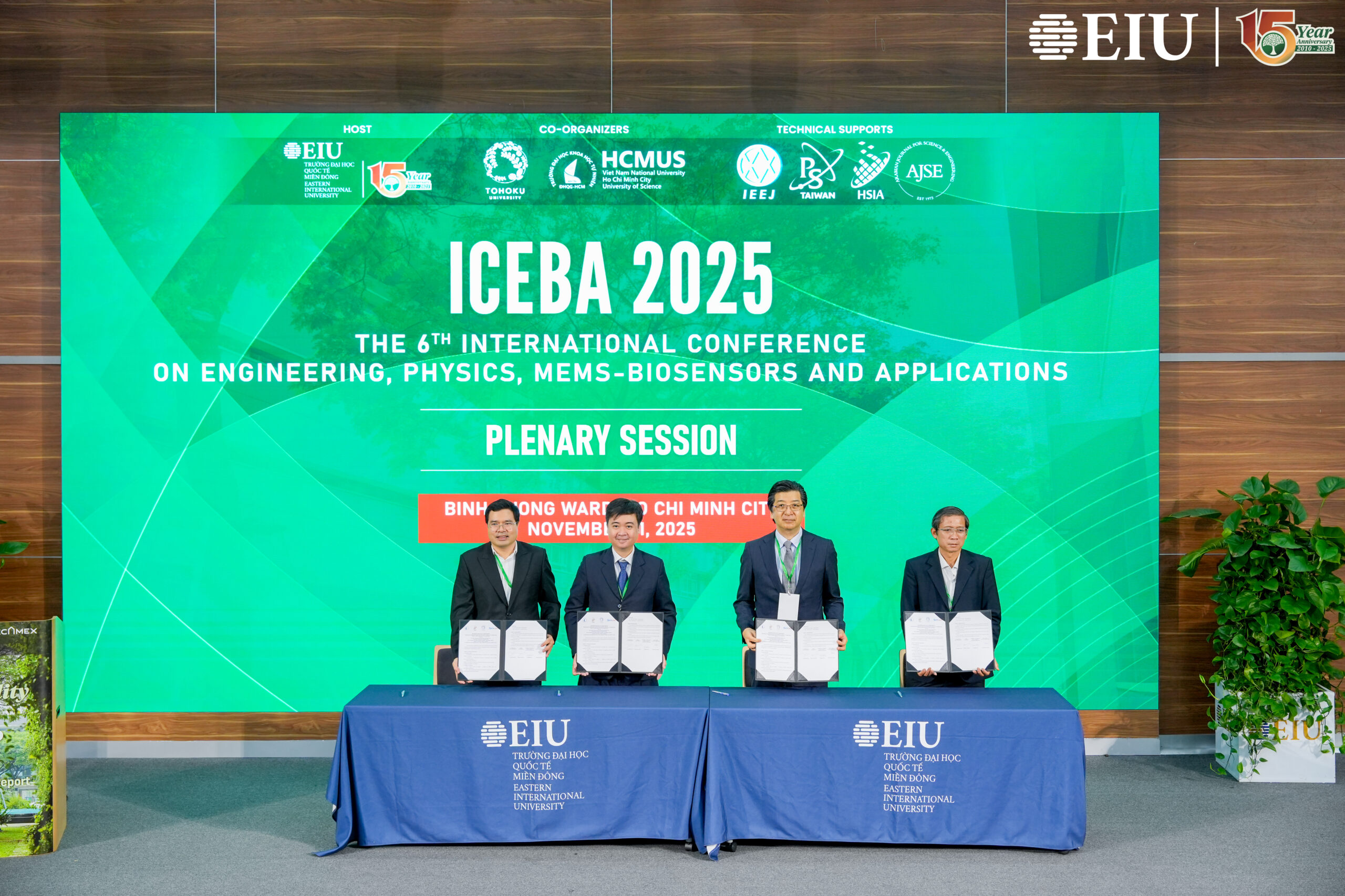 Hội nghị quốc tế ICEBA 2025 (International Conference on Engineering, Physics, MEMS–Biomedical Sensors and Applications) lần thứ 6 đã khép lại thành công sau chuỗi hoạt động học thuật diễn ra tại hai điểm cầu: Đại học Quốc lập Trung ương Đài Loan (NCU) và Trường Đại học Quốc tế Miền Đông (EIU), Bình Dương (11–12/11). Sự kiện do Trường Đại học Khoa học tự nhiên, ĐHQG-HCM phối hợp cùng Đại học Tohoku (Nhật Bản), Đại học NCU (Đài Loan) và EIU đồng tổ chức.
