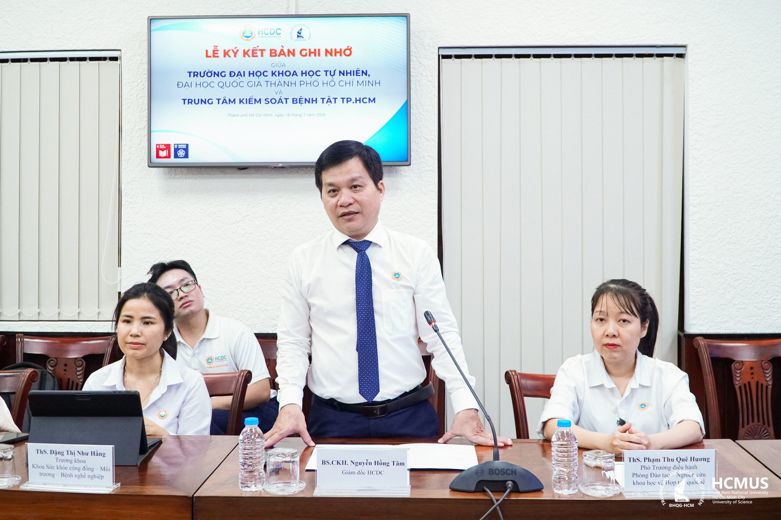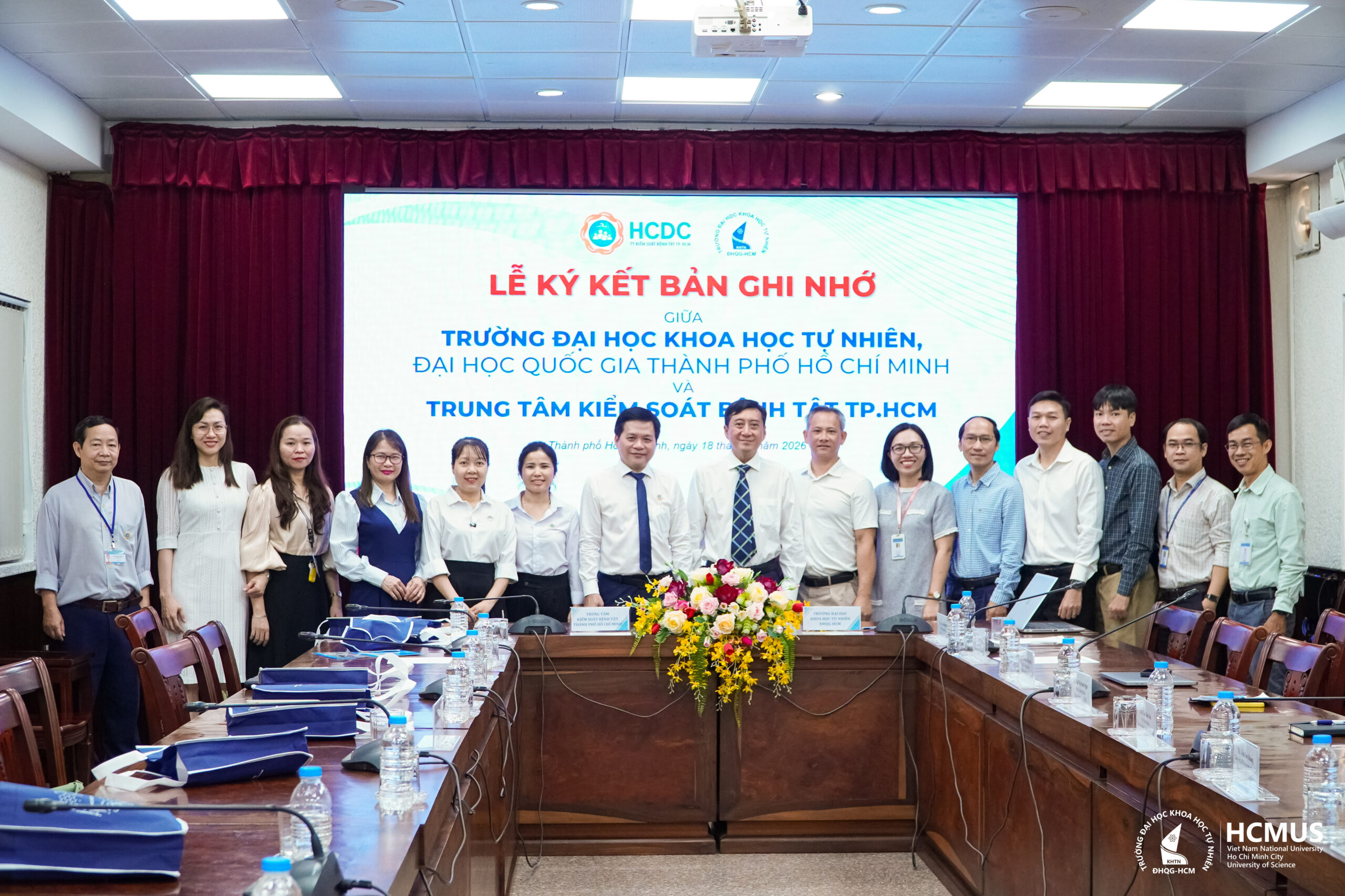 Sáng ngày 18/3/2026, tại Trường Đại học Khoa học tự nhiên, ĐHQG-HCM (HCMUS) đã diễn ra Lễ ký kết Biên bản ghi nhớ hợp tác (MoU) giữa Nhà trường và Trung tâm Kiểm soát bệnh tật TP.HCM (HCDC), đánh dấu bước phát triển mới trong mối quan hệ hợp tác giữa hai đơn vị trong lĩnh vực đào tạo, nghiên cứu và ứng dụng phục vụ y tế công cộng.