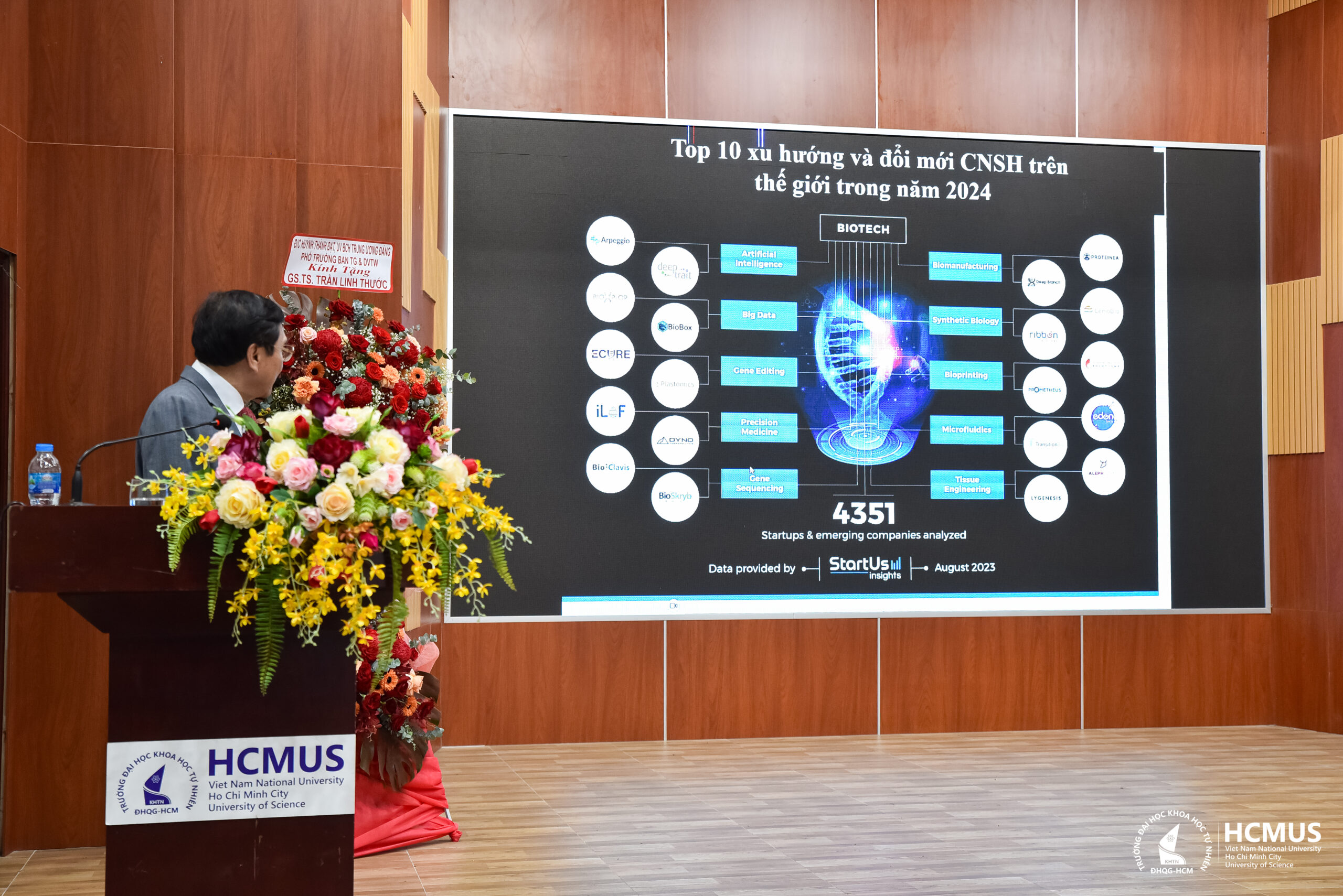 GS.TS Thước đã điểm lại 10 xu hướng và đổi mới hàng đầu của CNSH thế giới năm 2024, bao gồm: ứng dụng trí tuệ nhân tạo (AI) trong phát triển thuốc và chẩn đoán bệnh, phân tích dữ liệu lớn (big data) từ công nghệ omics, chỉnh sửa gen bằng CRISPR-Cas9, y học chính xác và cá nhân hóa, giải trình tự DNA thế hệ mới (NGS), sản xuất sinh học, in sinh học 3D, sinh học tổng hợp, hệ vi lưu chất và kỹ nghệ mô.