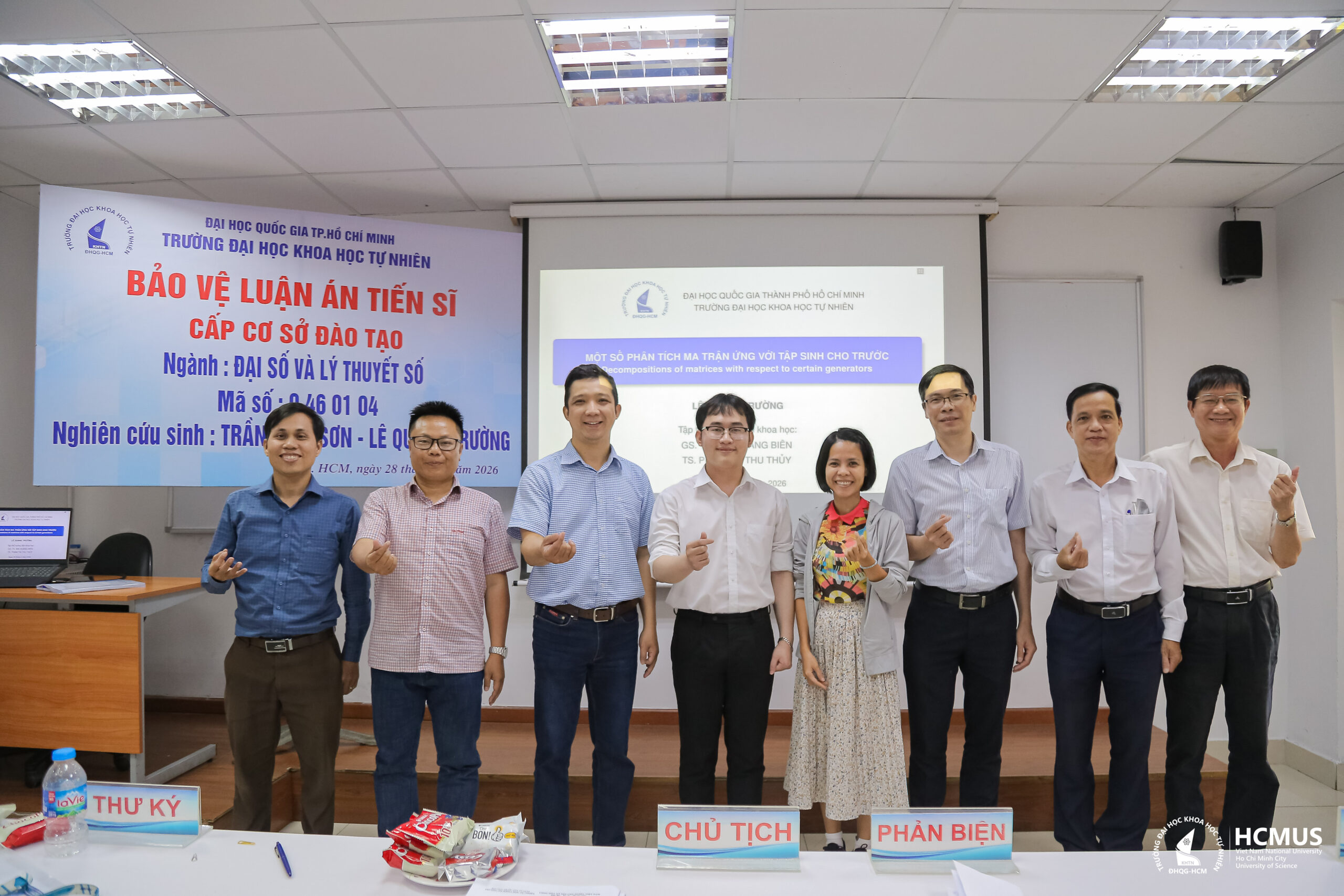 Sáng ngày 28/03/2026, tại Trường Đại học Khoa học tự nhiên, ĐHQG-HCM, nghiên cứu sinh Lê Quang Trường (khóa 2022) đã bảo vệ thành công luận án tiến sĩ cấp cơ sở đào tạo ngành Đại số và Lý thuyết số với đề tài: “Một số phân tích ma trận ứng với tập sinh cho trước”.