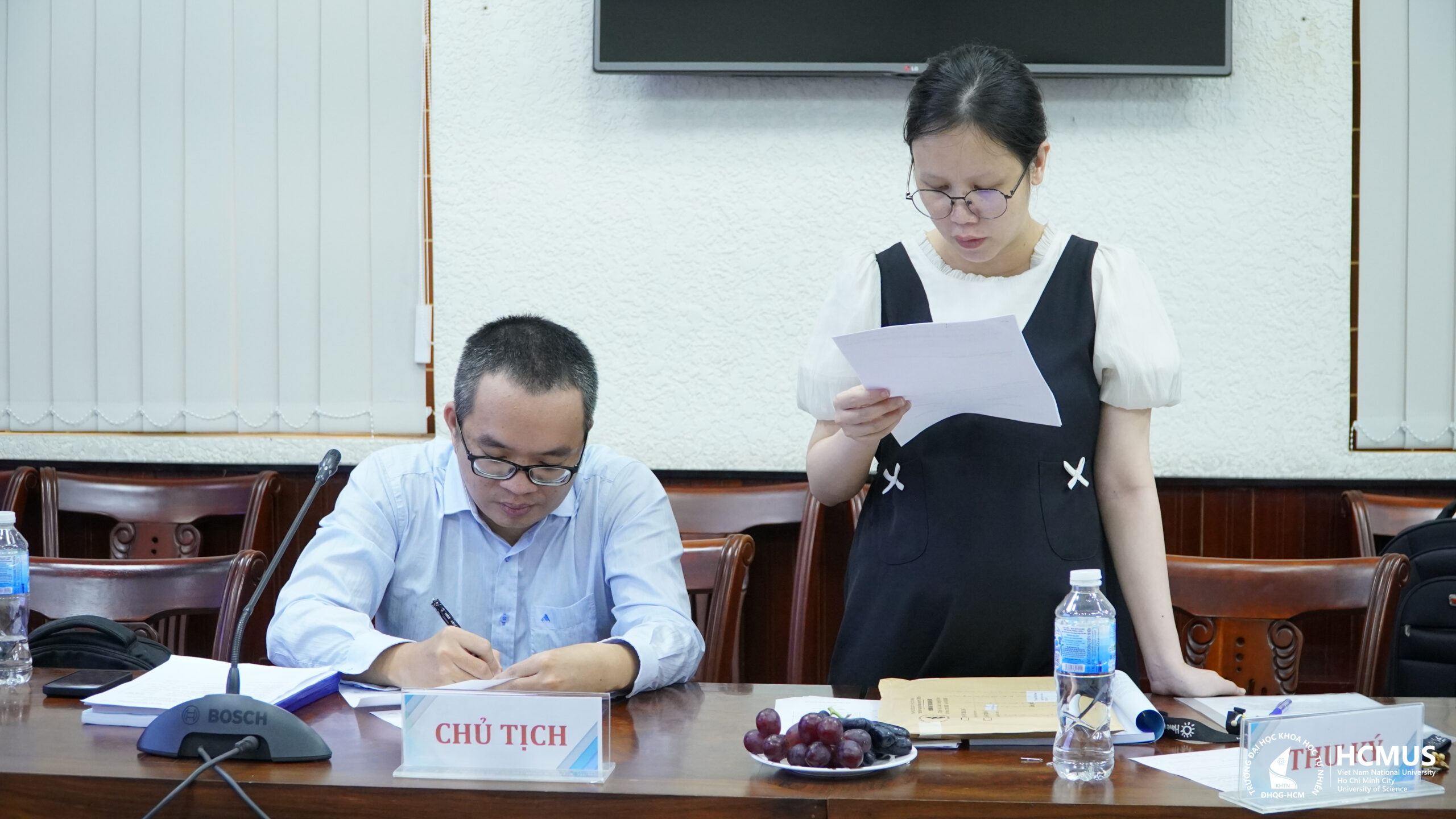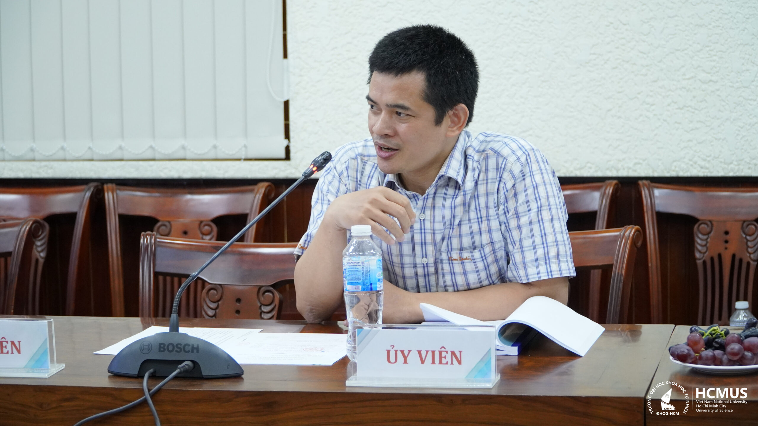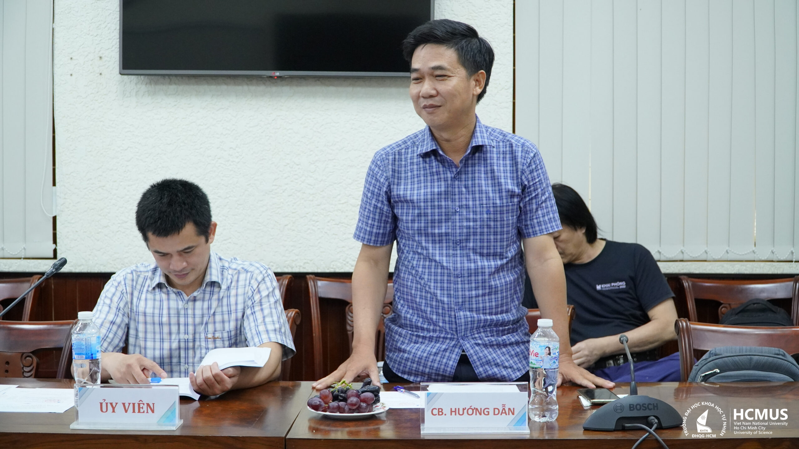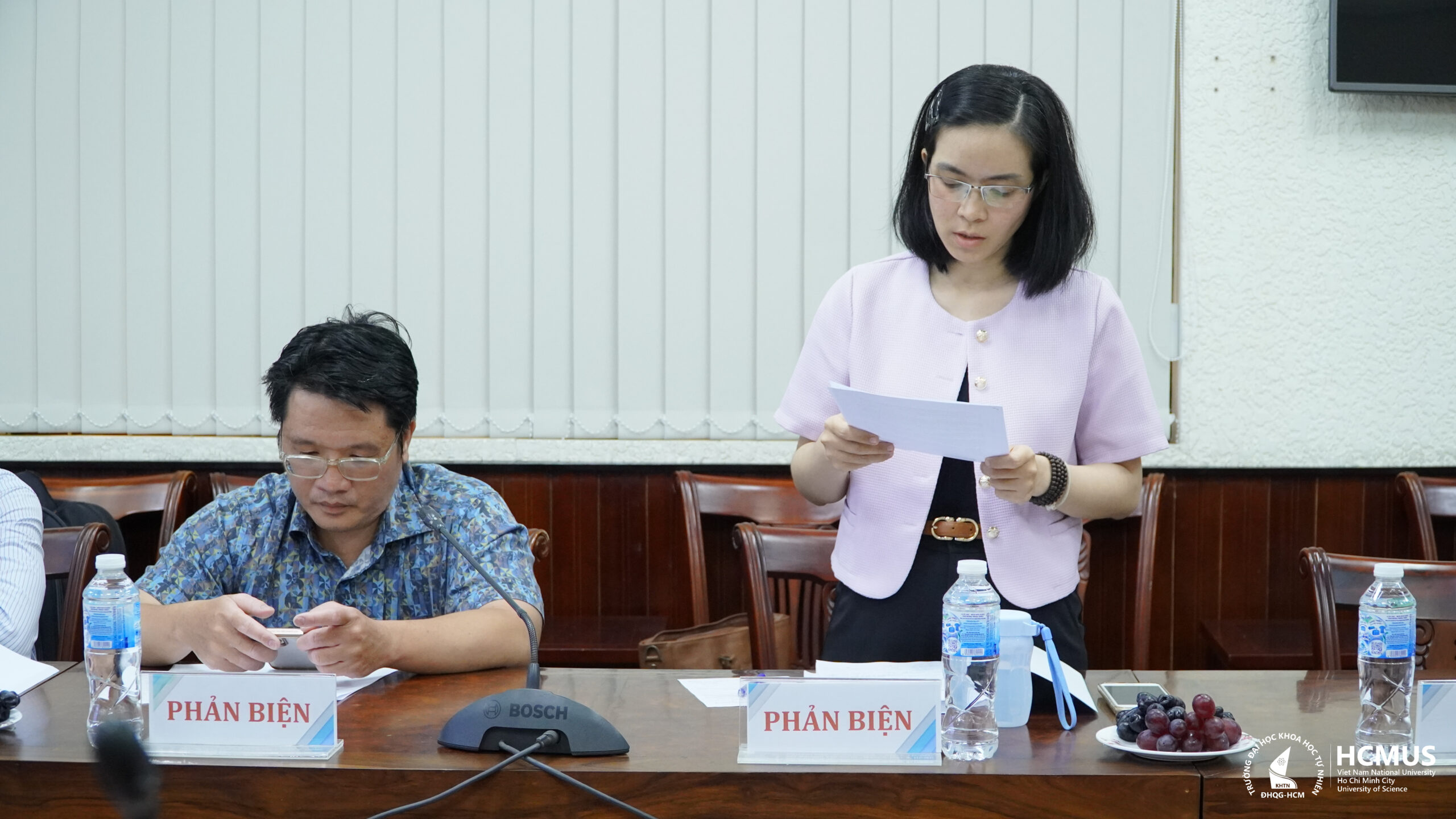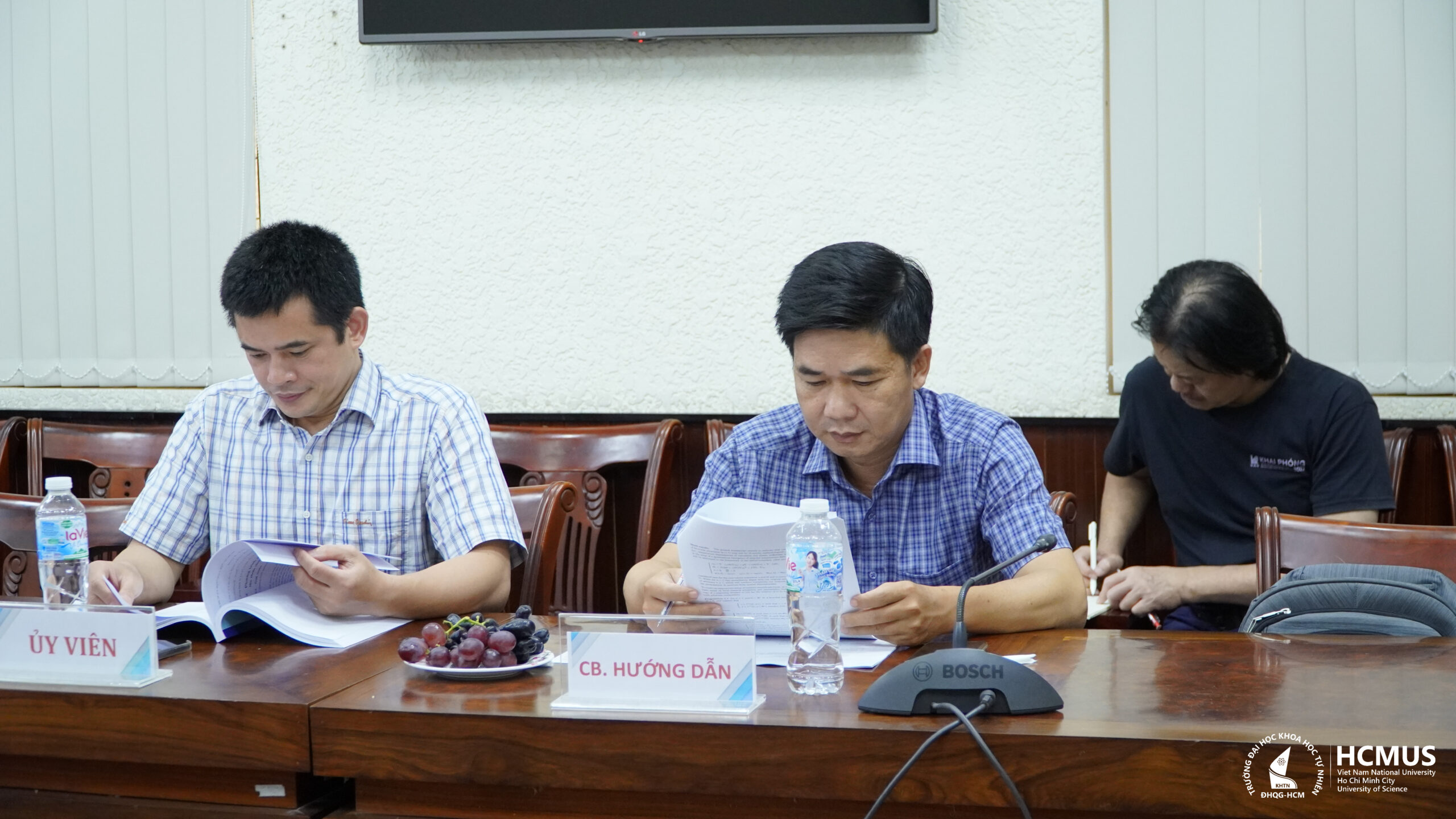 Hội đồng đánh giá luận án tiến sĩ cấp cơ sở đào tạo trao đổi, nhận xét và đặt câu hỏi chuyên môn với NCS. Quách Văn Chương trong buổi bảo vệ.