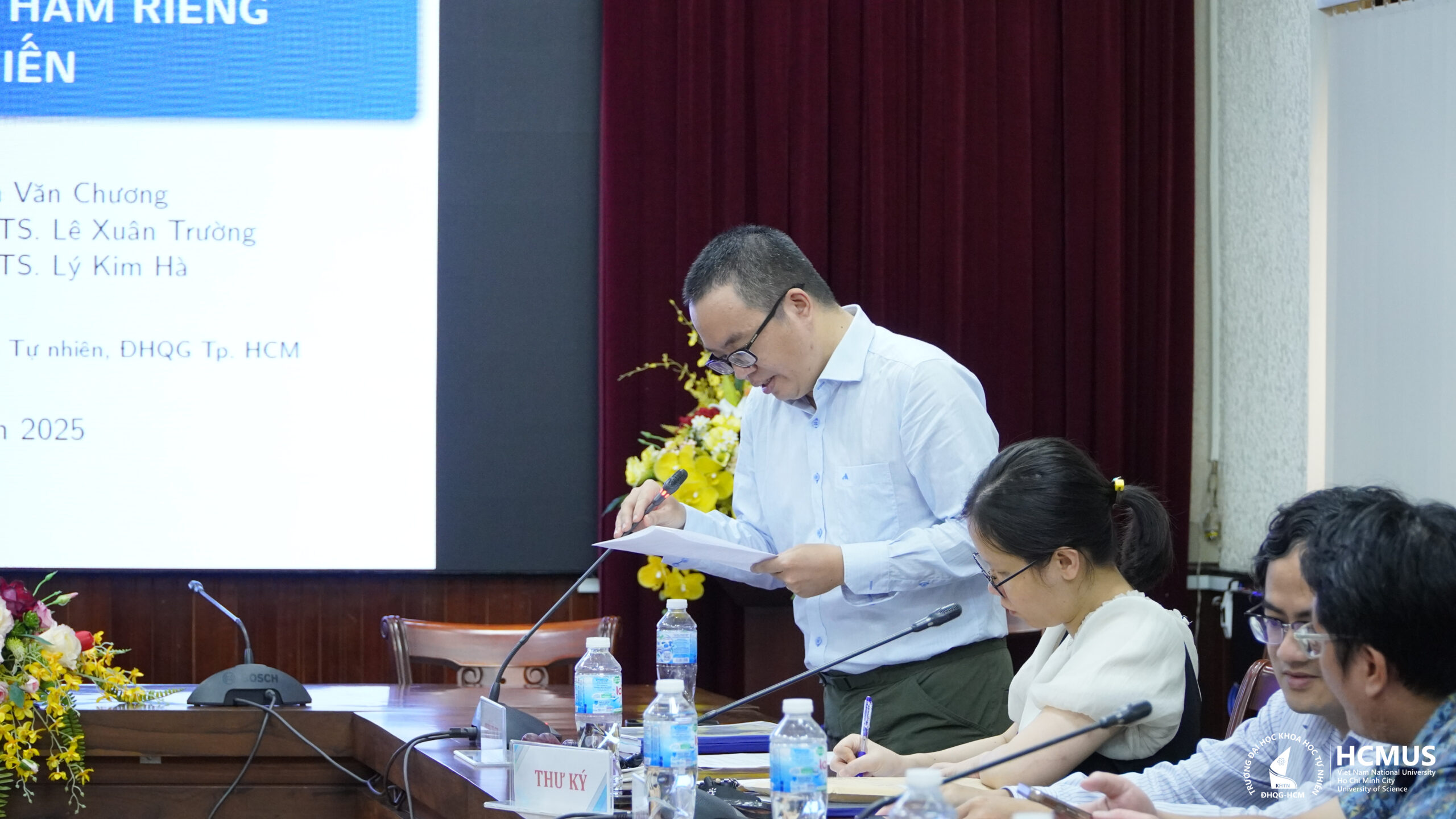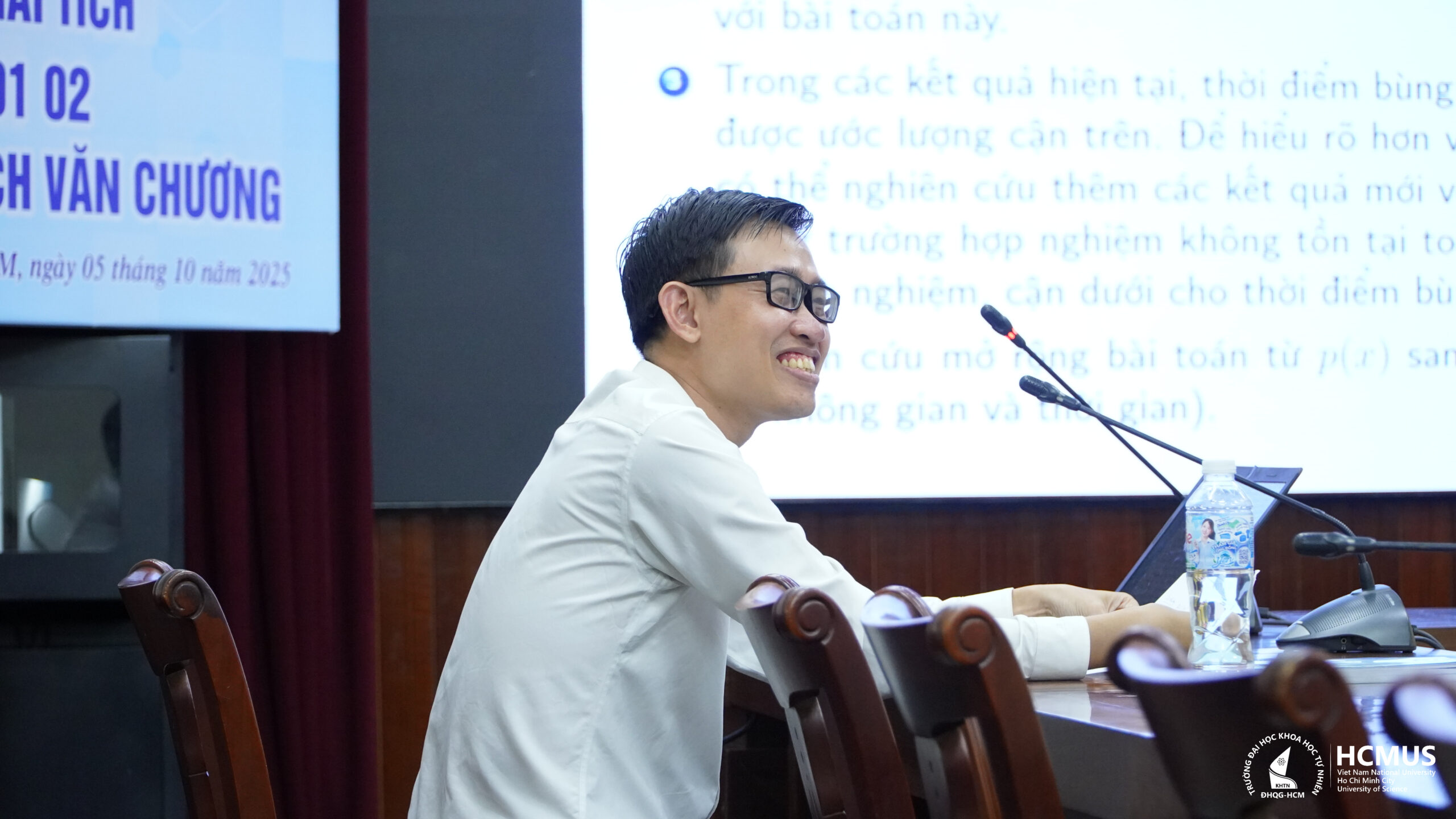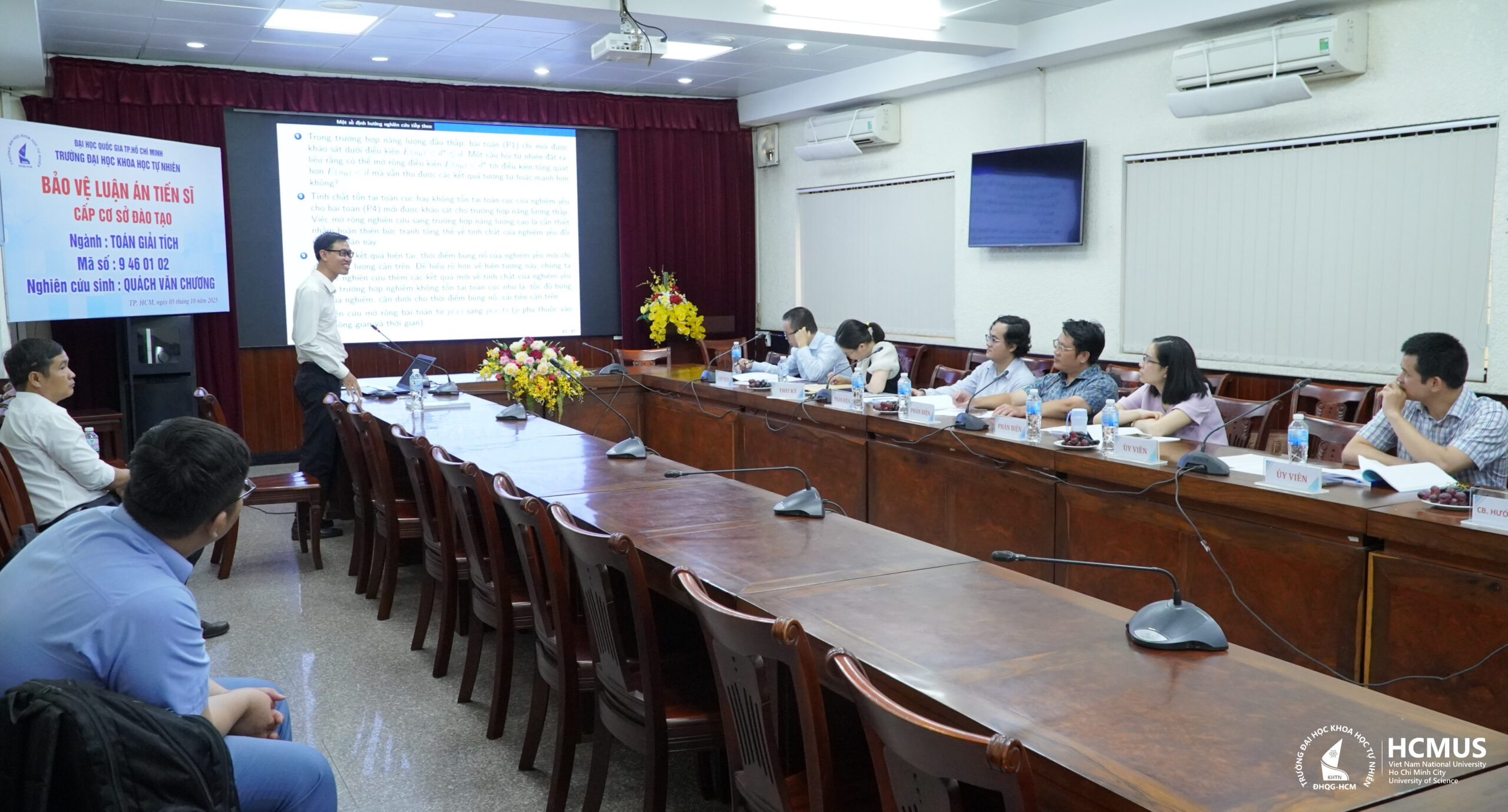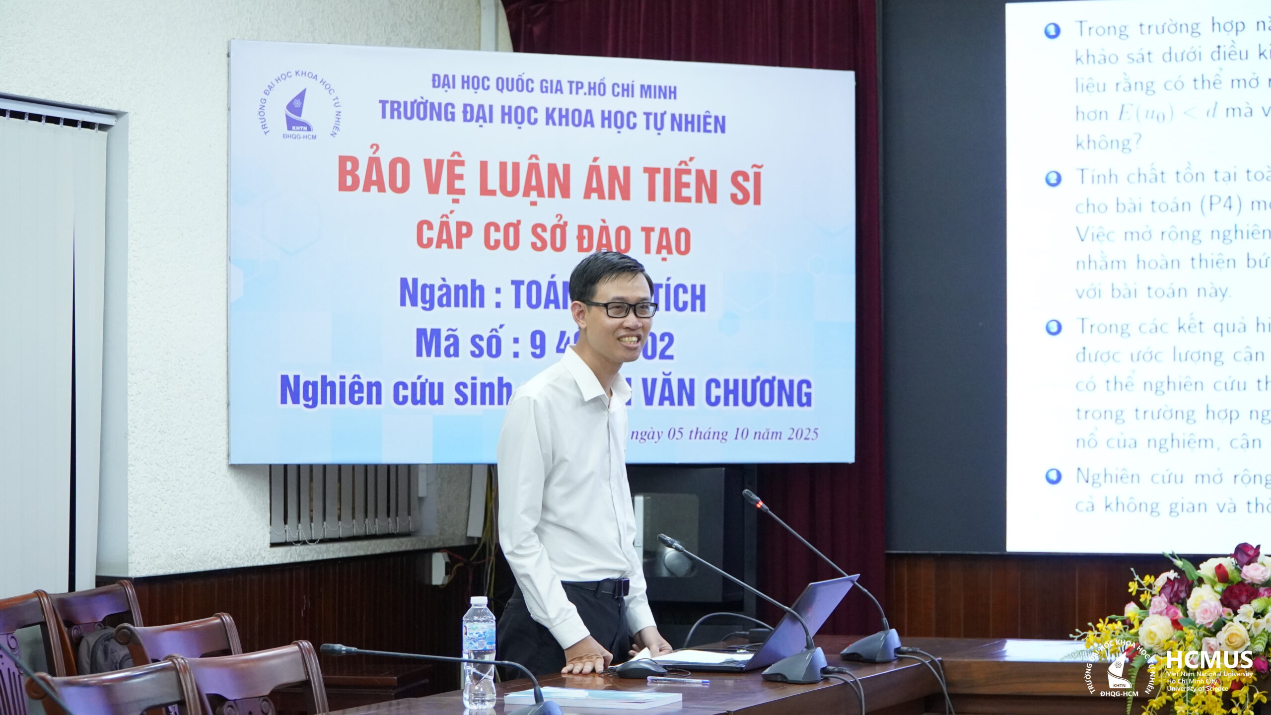 Sáng ngày 05/10, tại Trường Đại học Khoa học tự nhiên, ĐHQG-HCM, Nghiên cứu sinh Quách Văn Chương đã bảo vệ luận án tiến sĩ cấp cơ sở đào tạo với đề tài: “Tính chất định tính của một số lớp phương trình đạo hàm riêng với số mũ biến”, ngành Toán Giải tích. Luận án được thực hiện dưới sự hướng dẫn của PGS.TS. Lê Xuân Trường và PGS.TS. Lý Kim Hà, thuộc khóa đào tạo 2022–2025.
