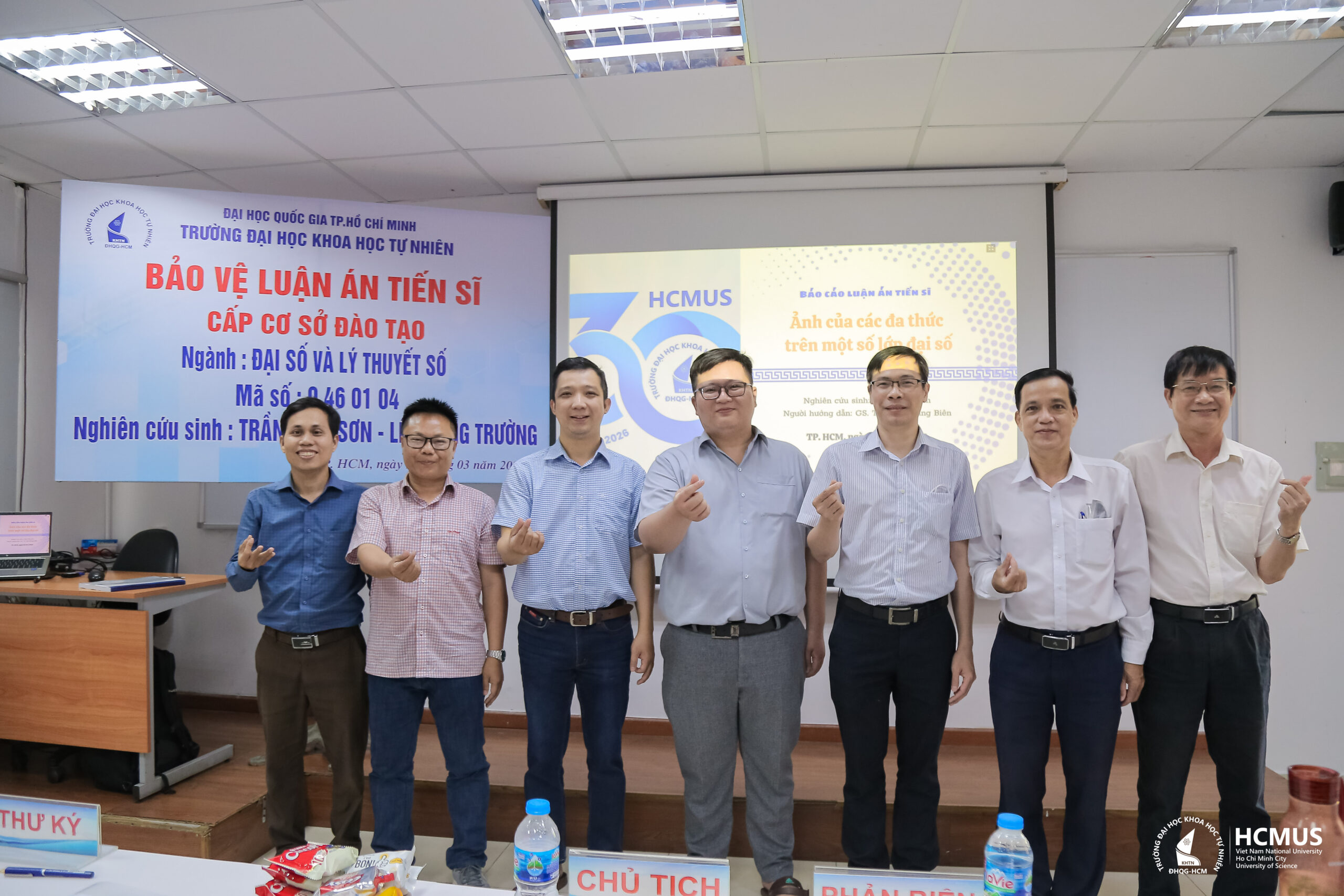 Sáng ngày 28/3/2026, tại Trường Đại học Khoa học tự nhiên, ĐHQG-HCM, nghiên cứu sinh Trần Nam Sơn (khóa 2022, ngành Đại số và Lý thuyết số) đã bảo vệ thành công luận án tiến sĩ cấp cơ sở đào tạo với đề tài: “Ảnh của các đa thức trên một số lớp đại số”.