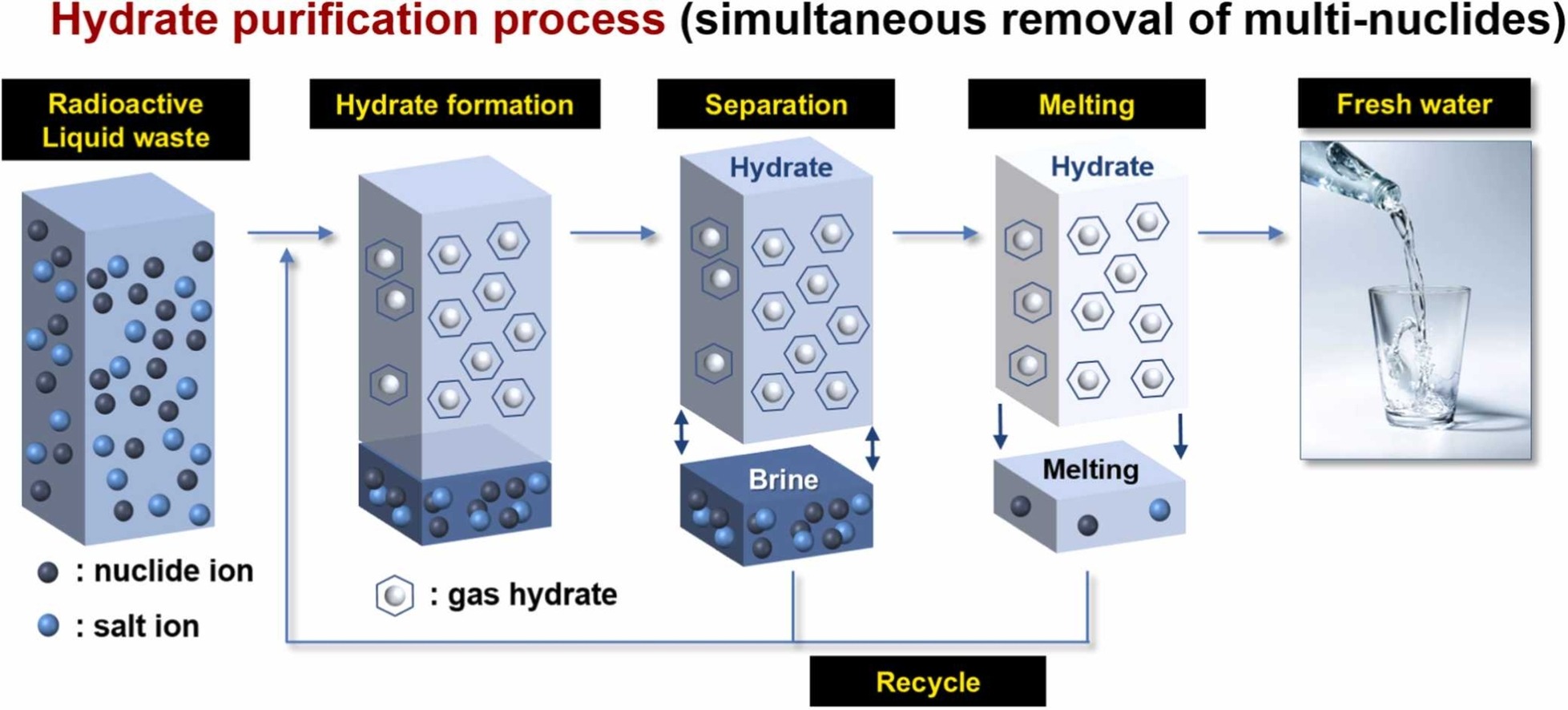 This study investigates the removal characteristics of a hydrate-based water purification process used to remove the major radionuclides monitored in nuclear accident areas. The effect of the coexistence of salt ions on the removal of radioactive materials is also evaluated. Previous studies have found existing processes such as ion exchange and membrane separation to be reliable methods for radionuclide removal from contaminated water. However, these processes cannot remove all contaminants at once and cause additional environmental problems by generating secondary wastes. In a previous study, we observed that water purification by the gas hydrate process could simultaneously remove various ions from seawater and hypersaline water in a single step without pre- or post-treatment. Therefore, the removal characteristics of Sr2+, Co2+, Cs+, and I– radionuclides are evaluated in only one context: the hydrate-based water purification process. More than 85% of the total ions were simultaneously removed regardless of the presence or absence of coexisting ions, and the time required for the removal process was about 70 min. In addition, it was observed that most of the contaminant ions were attached to hydrate crystal surfaces. Therefore, an efficient purification process is proposed that includes a hydrate crystal exterior partial dissolution step.