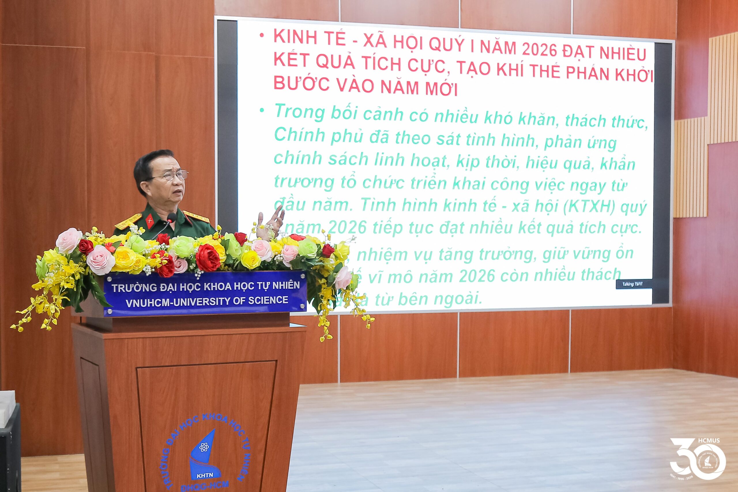 Sáng ngày 09/4/2026, Đảng ủy Trường Đại học Khoa học tự nhiên, ĐHQG-HCM đã tổ chức Sinh hoạt chính trị tập trung – đợt 1 năm 2026 dành cho cán bộ, đảng viên, viên chức, người lao động và sinh viên Nhà trường. Được triển khai theo Kế hoạch số 26-KH/ĐU ngày 26/3/2026 của Đảng ủy Trường, chương trình tập trung vào hai nội dung trọng tâm: Thông tin thời sự nổi bật quý I năm 2026 và tuyên dương, khen thưởng các tập thể, cá nhân đạt thành tích tiêu biểu năm 2025.