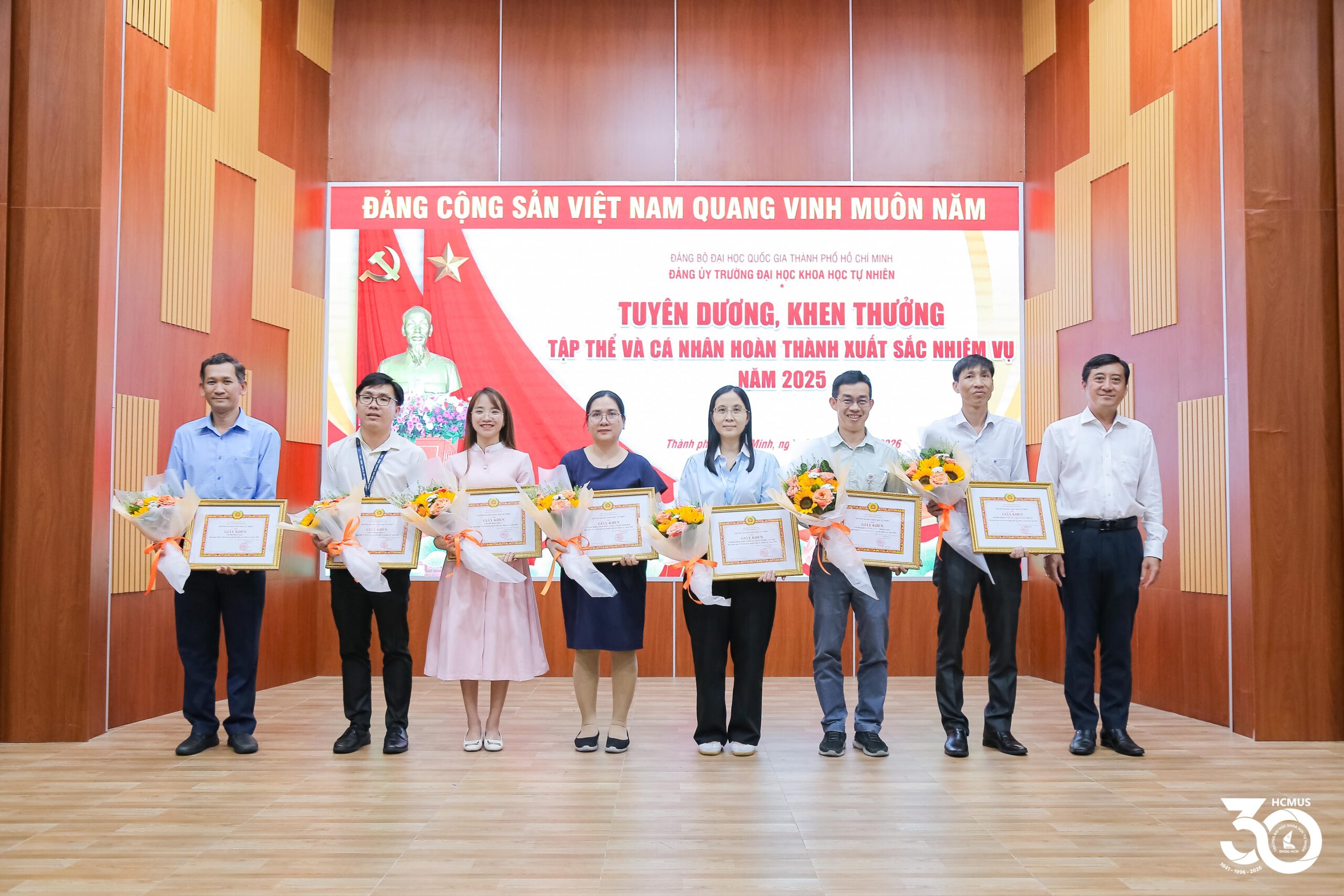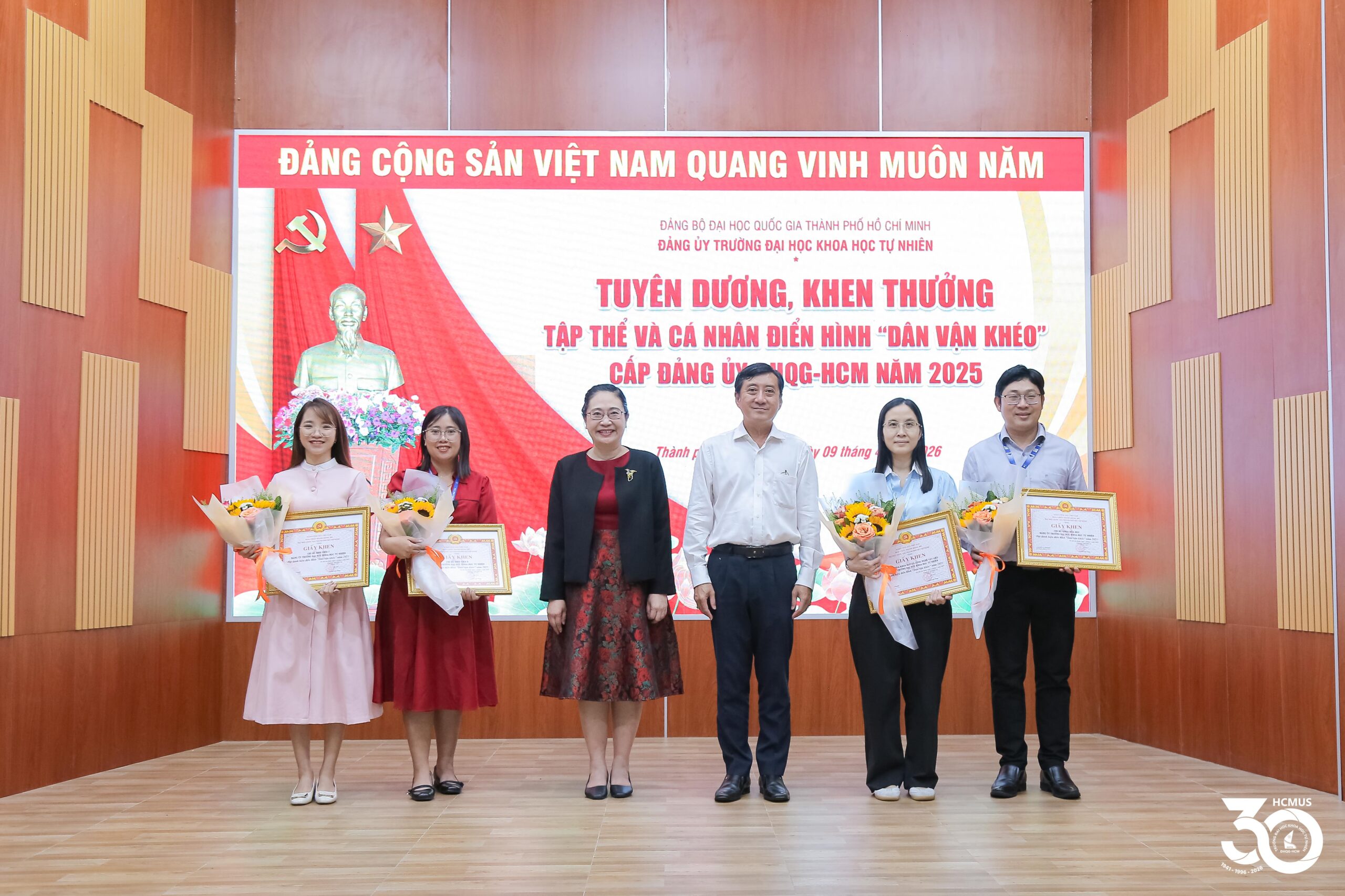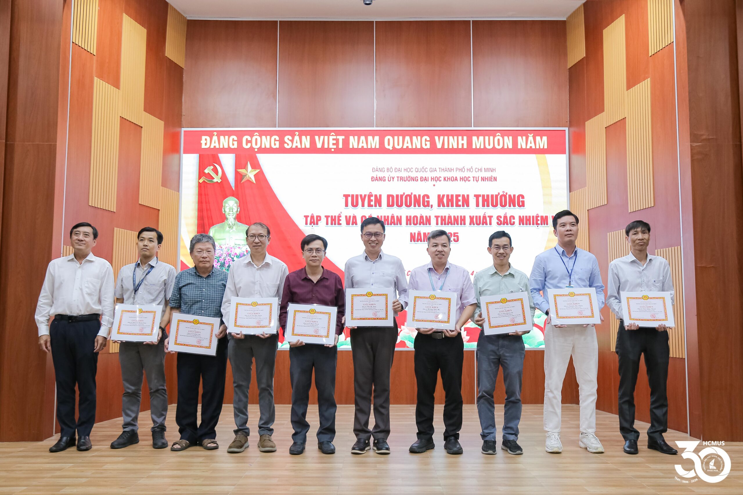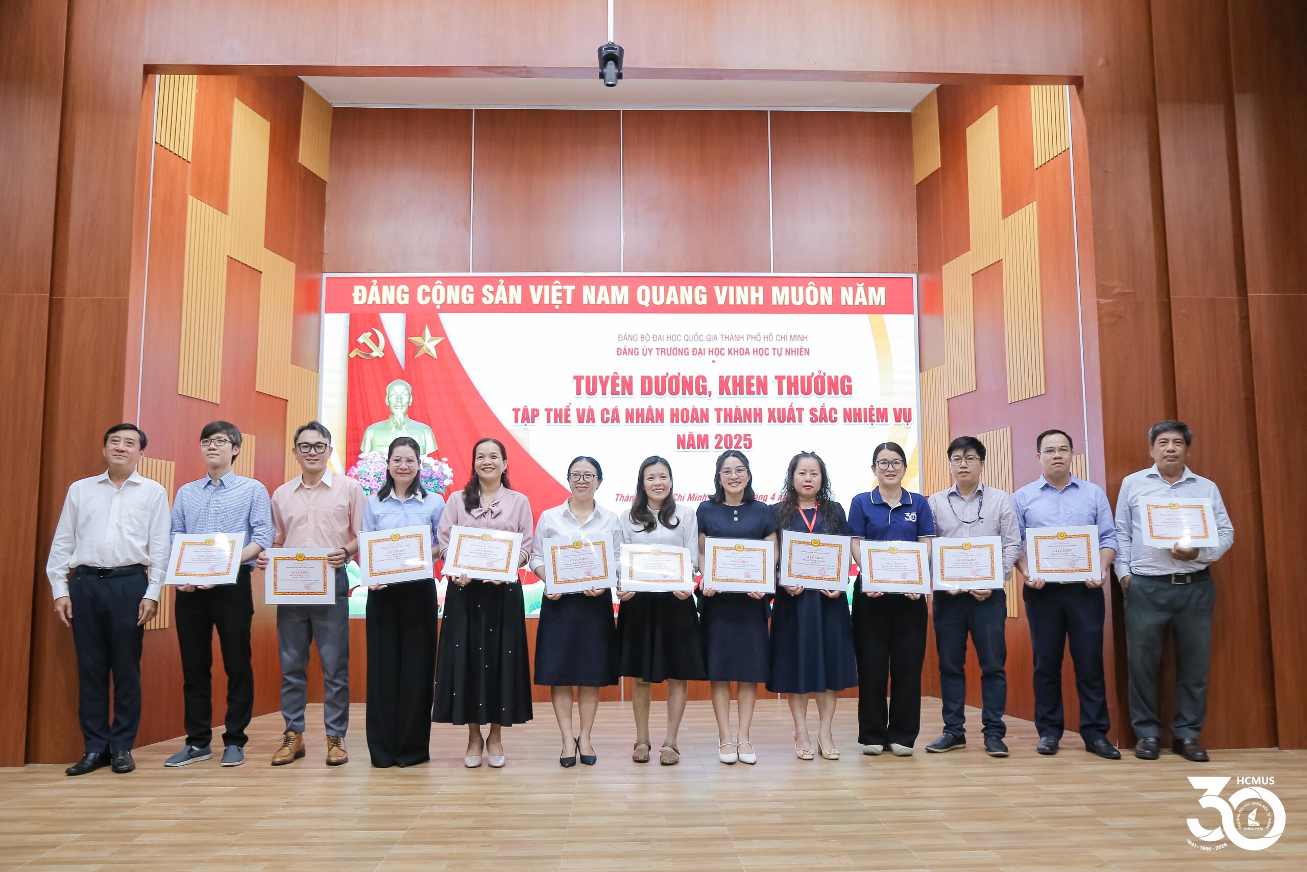 Tại chương trình, Đảng ủy Trường đã tuyên dương, khen thưởng nhiều tập thể, cá nhân có thành tích tiêu biểu trong năm 2025. Trong đó, có 07 tập thể và 103 cá nhân hoàn thành xuất sắc nhiệm vụ năm 2025; 01 đảng viên hoàn thành xuất sắc nhiệm vụ 05 năm liên tục; cùng 04 tập thể và 06 cá nhân đạt danh hiệu điển hình “Dân vận khéo” năm 2025 cấp Đảng ủy ĐHQG-HCM.
