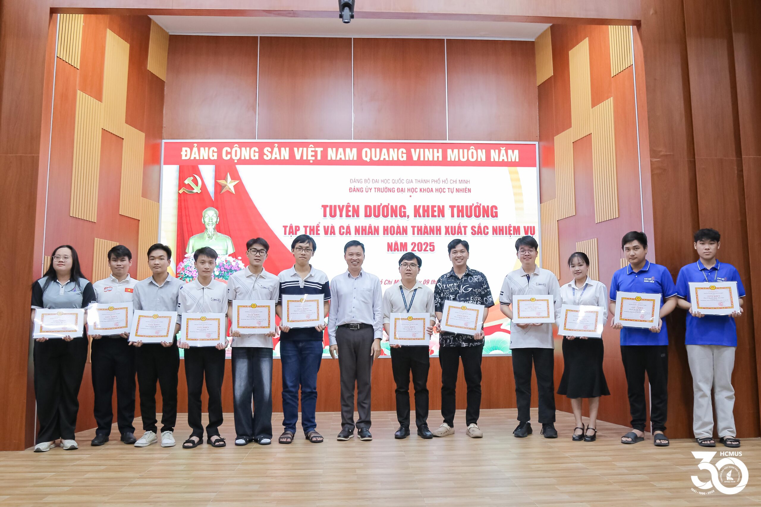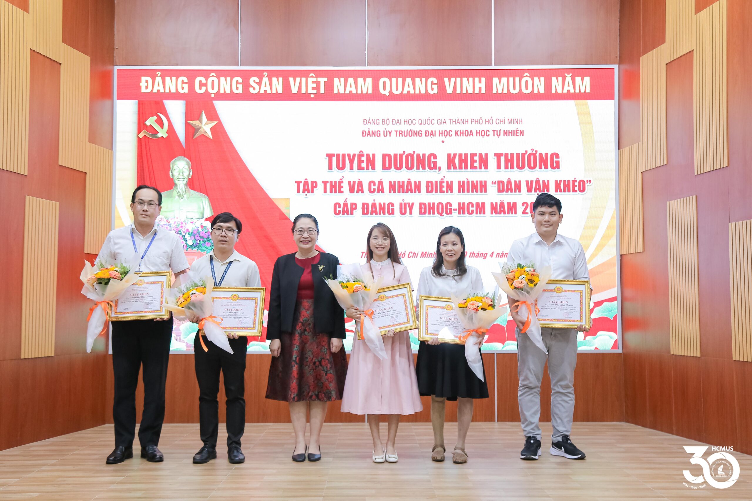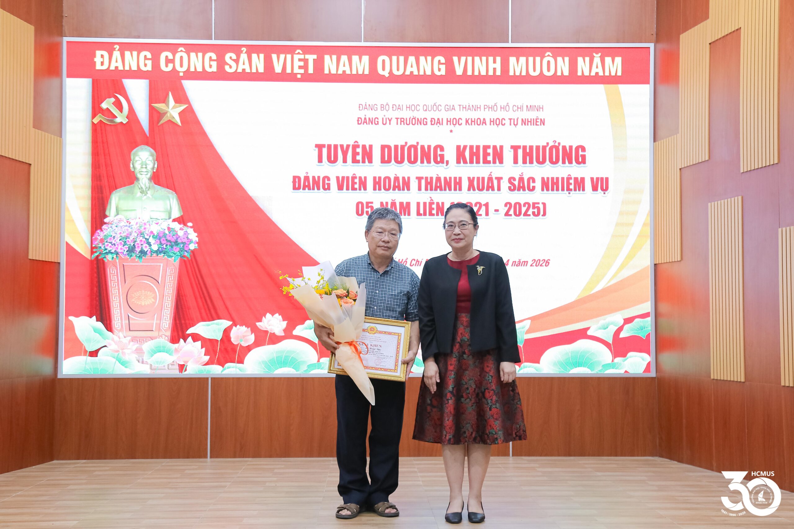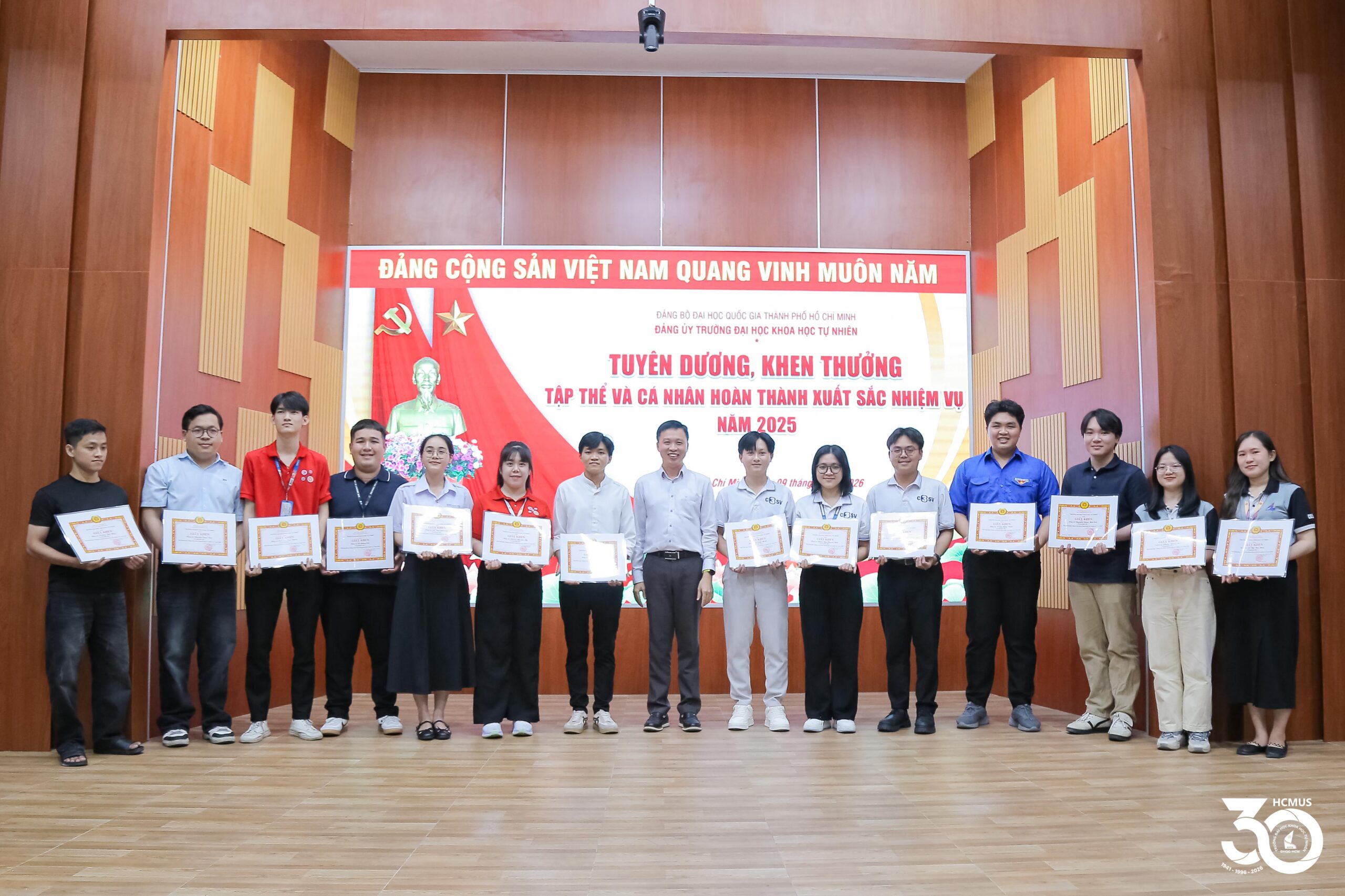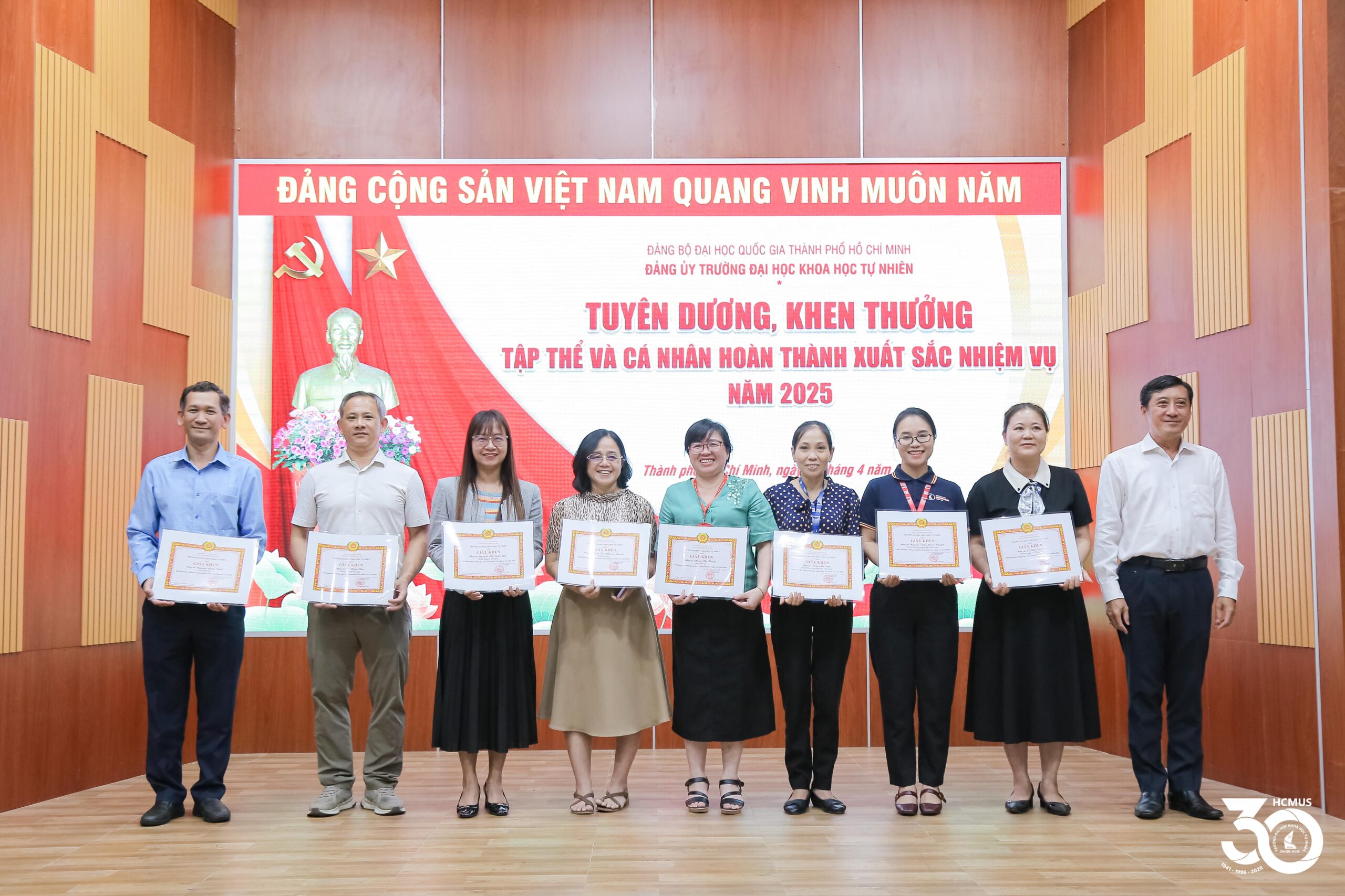 Tại chương trình, Đảng ủy Trường đã tuyên dương, khen thưởng nhiều tập thể, cá nhân có thành tích tiêu biểu trong năm 2025. Trong đó, có 07 tập thể và 103 cá nhân hoàn thành xuất sắc nhiệm vụ năm 2025; 01 đảng viên hoàn thành xuất sắc nhiệm vụ 05 năm liên tục; cùng 04 tập thể và 06 cá nhân đạt danh hiệu điển hình “Dân vận khéo” năm 2025 cấp Đảng ủy ĐHQG-HCM.