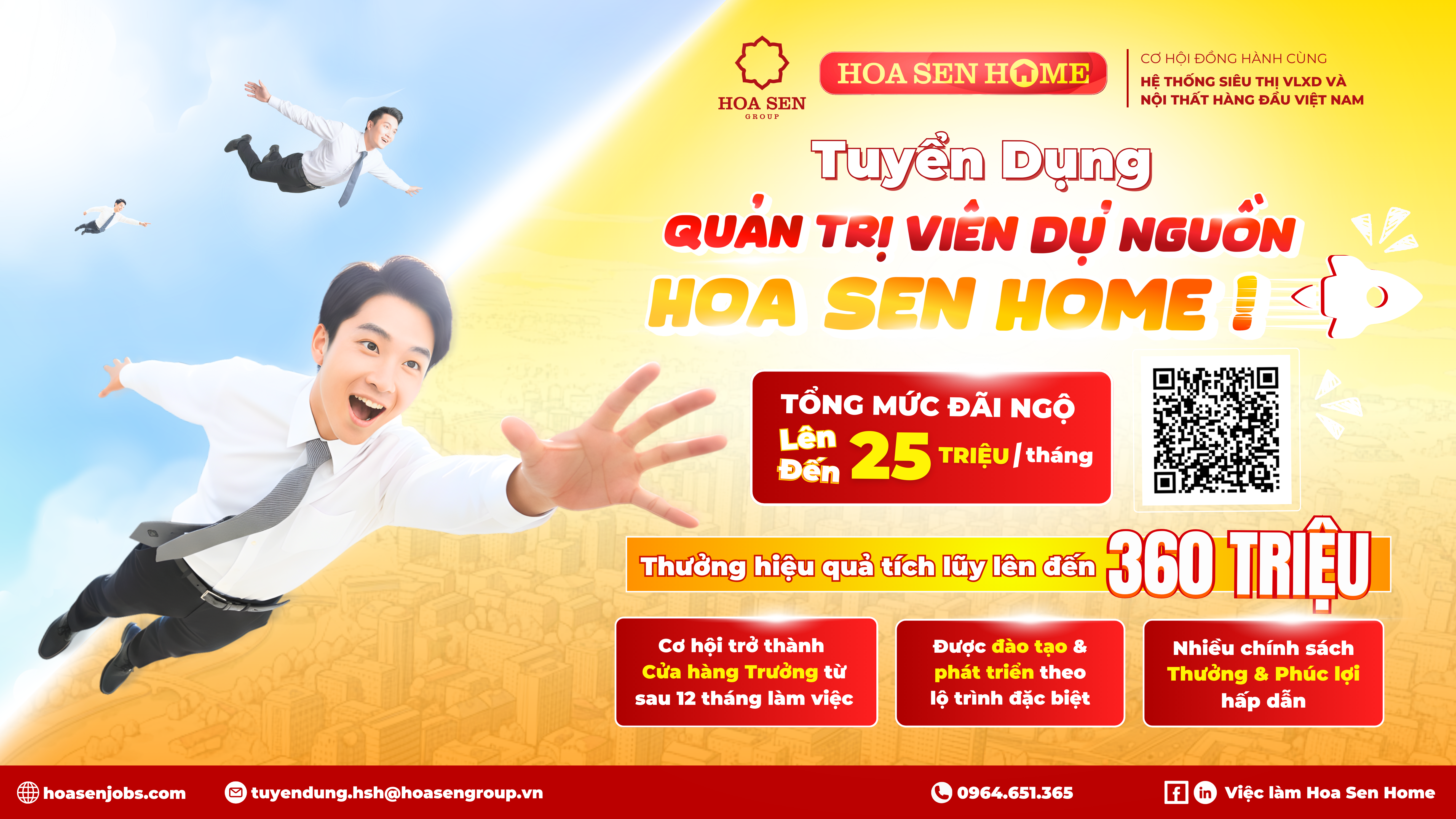 Hệ thống phân phối Hoa Sen Home (thuộc Tập đoàn Hoa Sen) đang triển khai chương trình Quản trị viên Dự nguồn, là chương trình Tuyển dụng – Đào tạo – Phát triển đội ngũ Cán bộ Quản lý kế thừa cho Hoa Sen Home; được thiết kế đặc biệt, chuyên sâu, thực tế, và có lộ trình thăng tiến rõ ràng theo từng giai đoạn, phù hợp với các bạn sinh viên đã tốt nghiệp/sinh viên năm cuối định hướng theo đuổi lĩnh vực kinh doanh. Mọi thông tin chi tiết, xin vui lòng xem file đính kèm. THÔNG TIN CHƯƠNG TRÌNH QTVDN HSH
