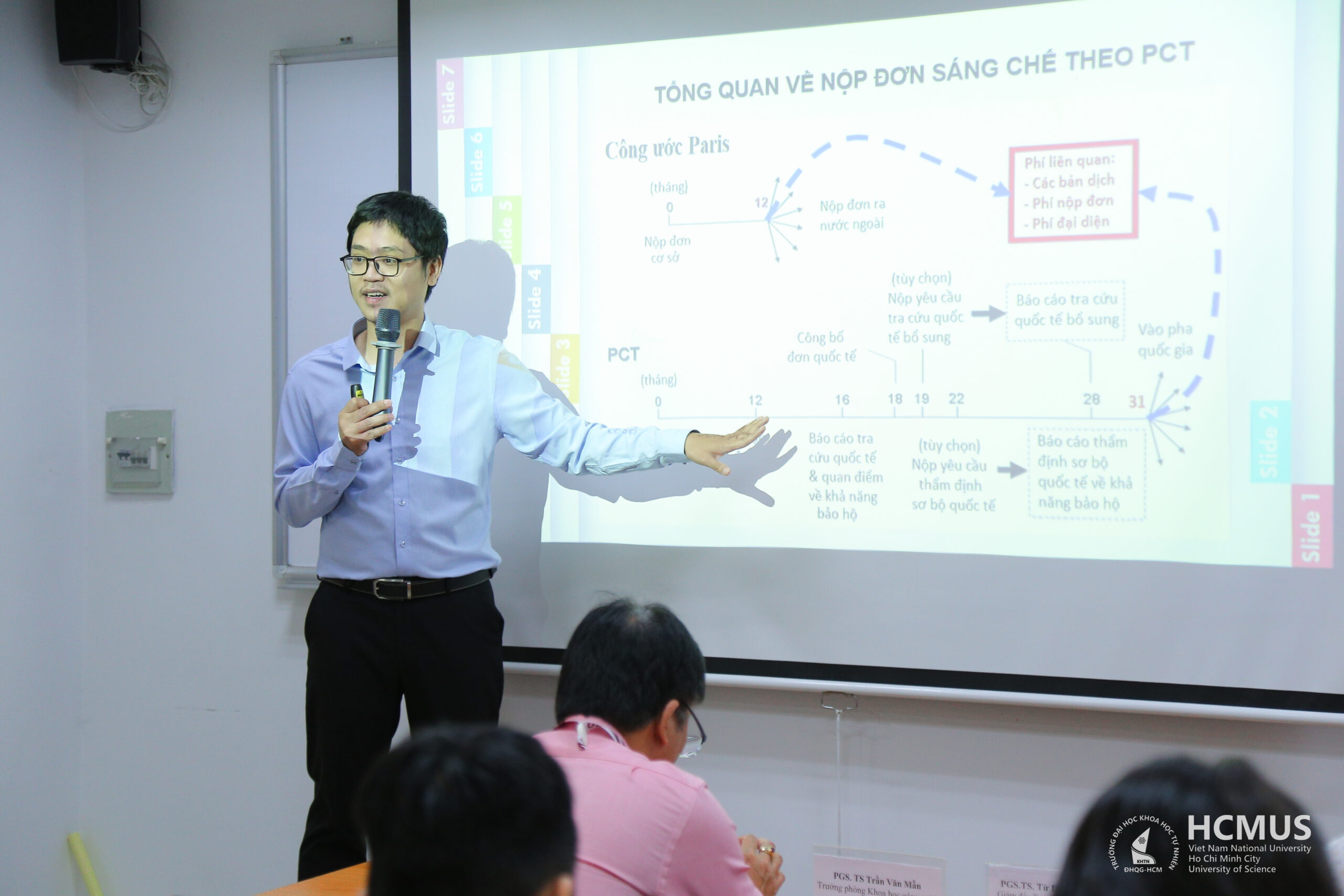 Ông Vương Hoàng Nguyên, Trưởng phòng Sở hữu trí tuệ, Trung tâm IPTC, ĐHQG-HCM trình bày chuyên đề “Hướng dẫn đăng ký sáng chế Hoa Kỳ trực tuyến”.