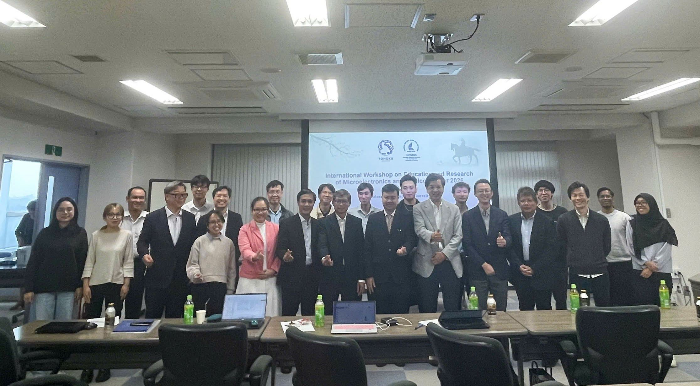 Bên cạnh đó, đoàn đã tham dự Hội thảo quốc tế về Đào tạo và Nghiên cứu Vi điện tử và Bán dẫn 2026 do Đại học Tohoku tổ chức. Hội thảo quy tụ nhiều nhà khoa học đến từ Nhật Bản và Việt Nam, tập trung vào các hướng nghiên cứu như cảm biến MEMS, vật liệu 2D, cảm biến sinh học, vi mạch VLSI và các ứng dụng trong y sinh, môi trường.