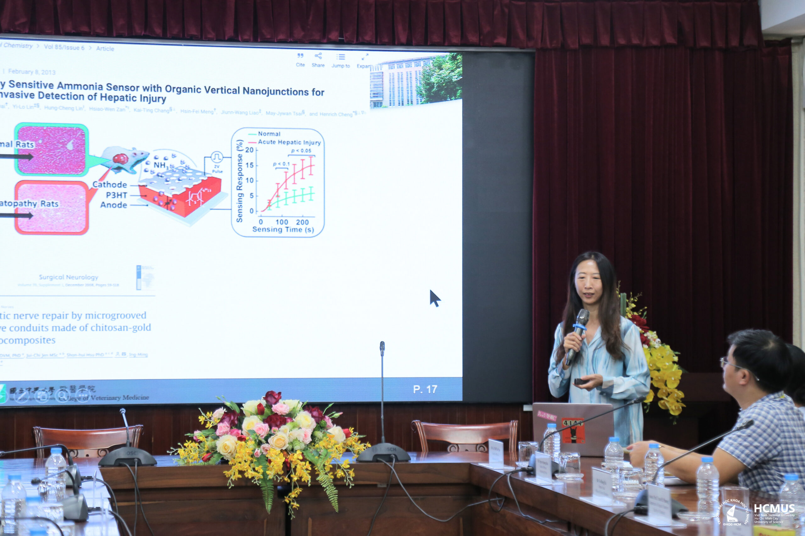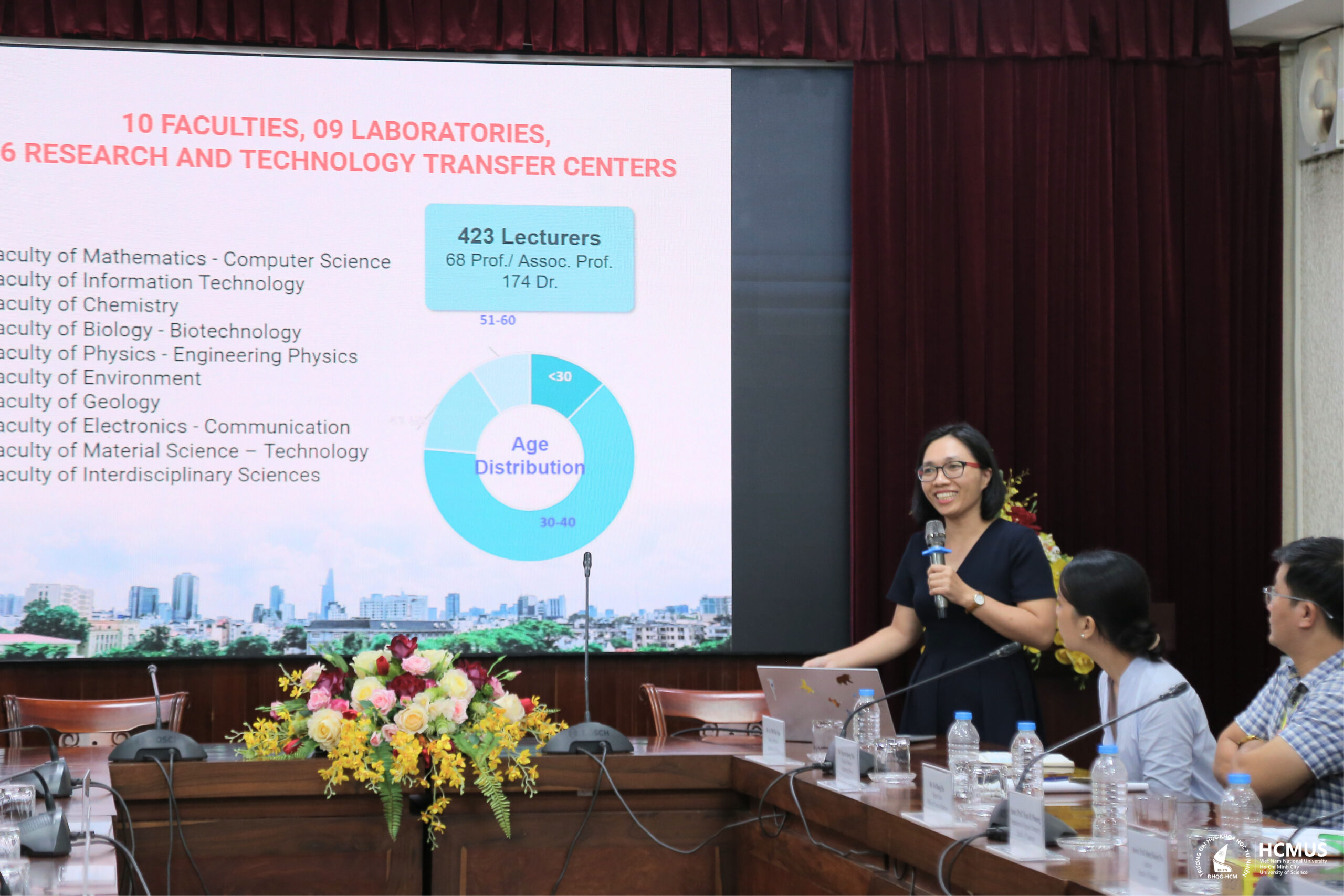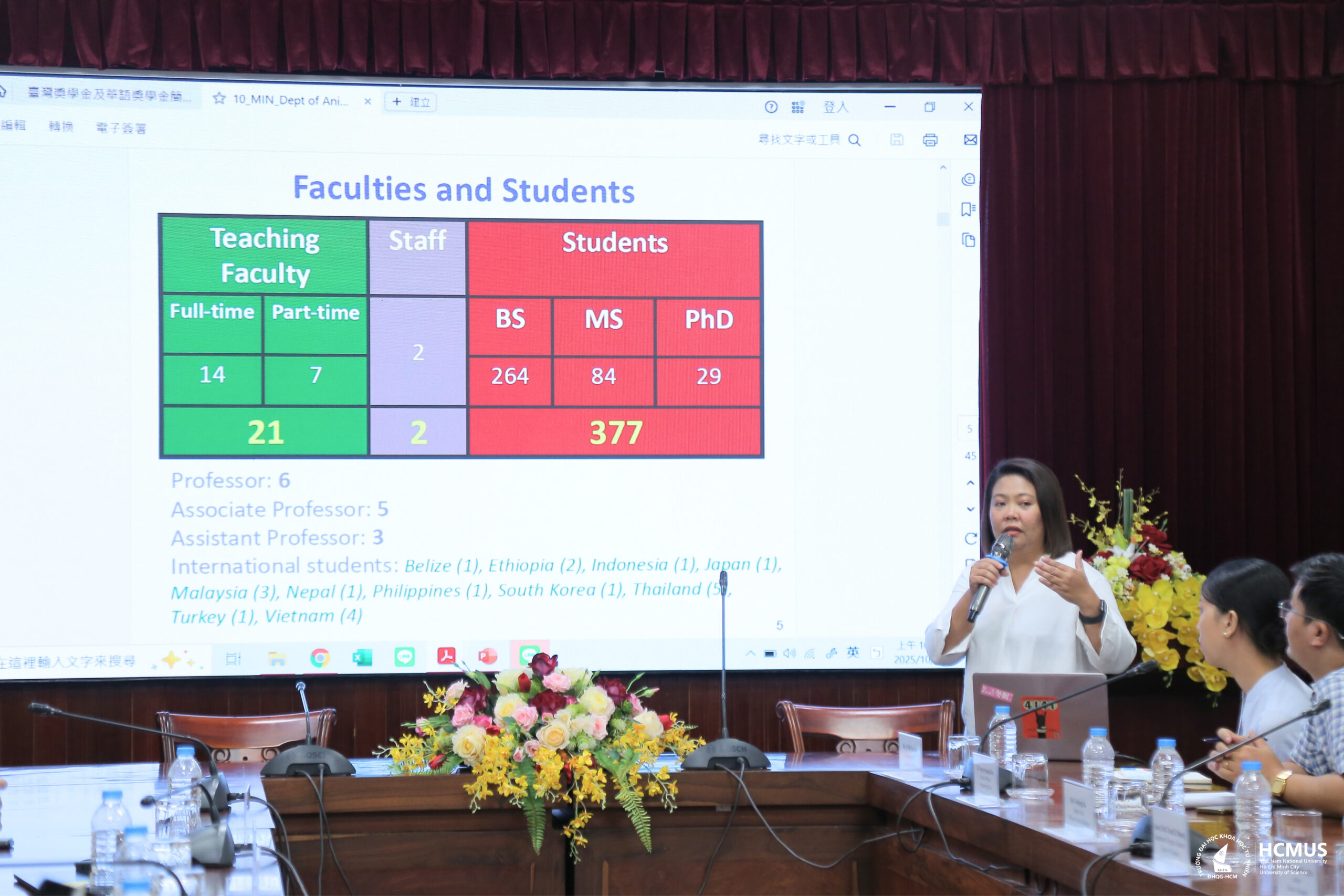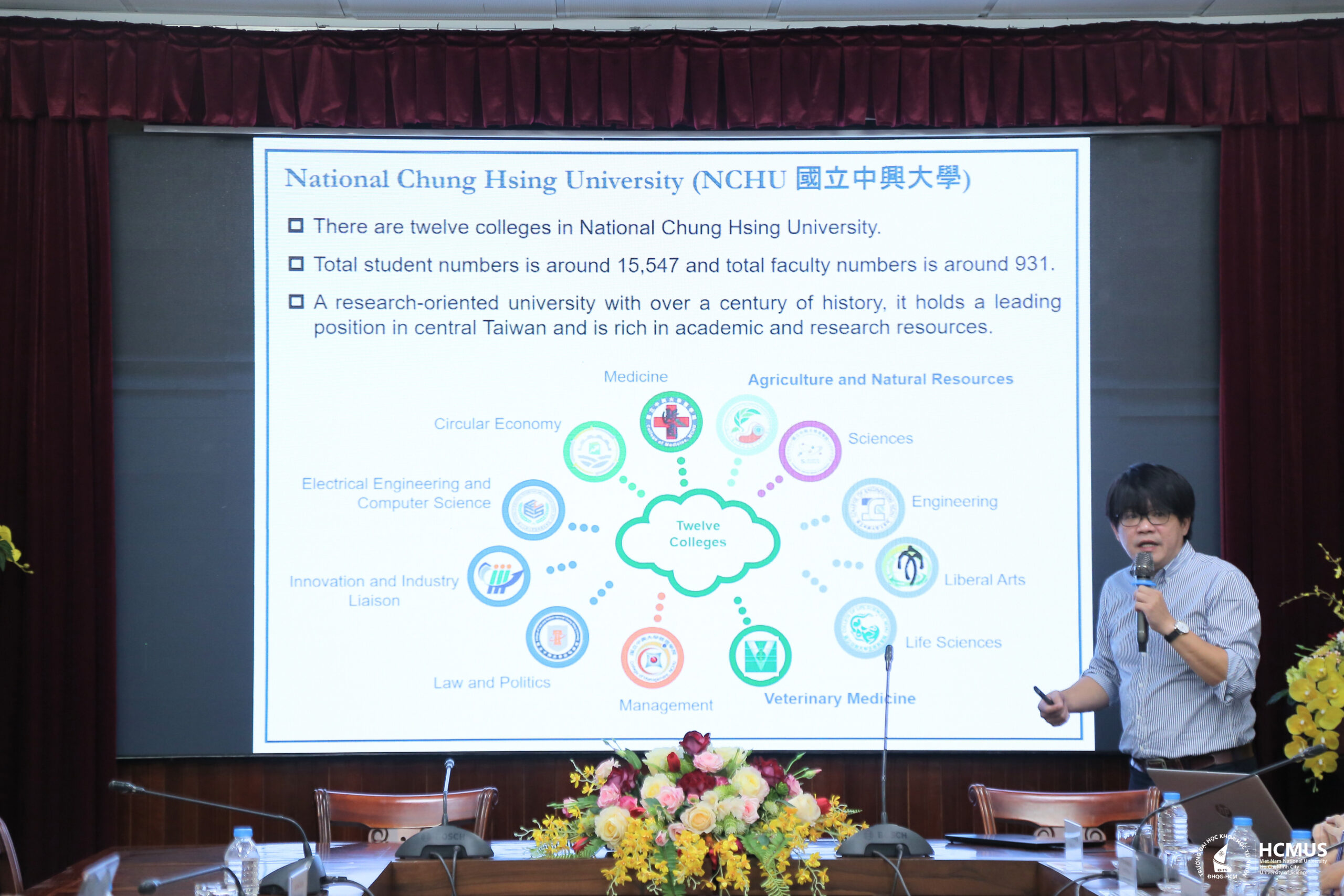 Trong phần giới thiệu, đại diện HCMUS trình bày tổng quan năng lực đào tạo và nghiên cứu, đặc biệt là các hướng phát triển của Khoa Sinh học – Công nghệ Sinh học như sinh lý – sinh hóa thực vật, công nghệ vi sinh, công nghệ tế bào và cảm biến sinh học. Phía NCHU chia sẻ các lĩnh vực đào tạo và nghiên cứu trọng điểm, bao gồm Nông nghiệp, Kỹ thuật cơ điện sinh học, Khoa học động vật và Thú y, đồng thời giới thiệu các dự án ứng dụng trí tuệ nhân tạo và tự động hóa trong nông nghiệp thông minh, góp phần tối ưu hóa canh tác, quản lý chăn nuôi và giám sát sức khỏe vật nuôi.