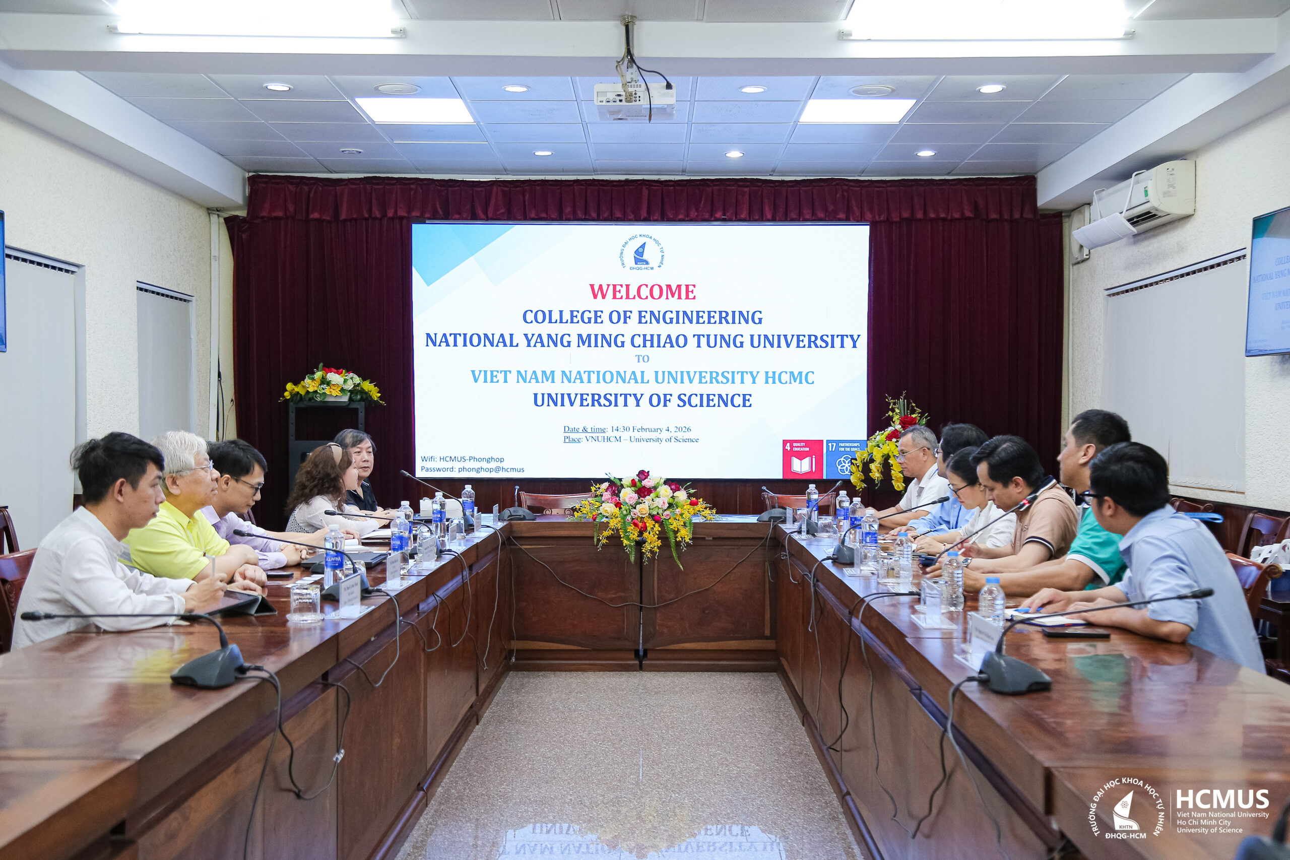 Chiều ngày 04/02/2026, tại Trường Đại học Khoa học tự nhiên, ĐHQG-HCM (HCMUS) đã diễn ra buổi làm việc giữa Nhà trường và đoàn đại biểu đến từ Khoa Khoa học và Kỹ thuật Vật liệu, Trường Kỹ thuật, Đại học Quốc lập Yang Ming Chiao Tung (NYCU), Đài Loan.