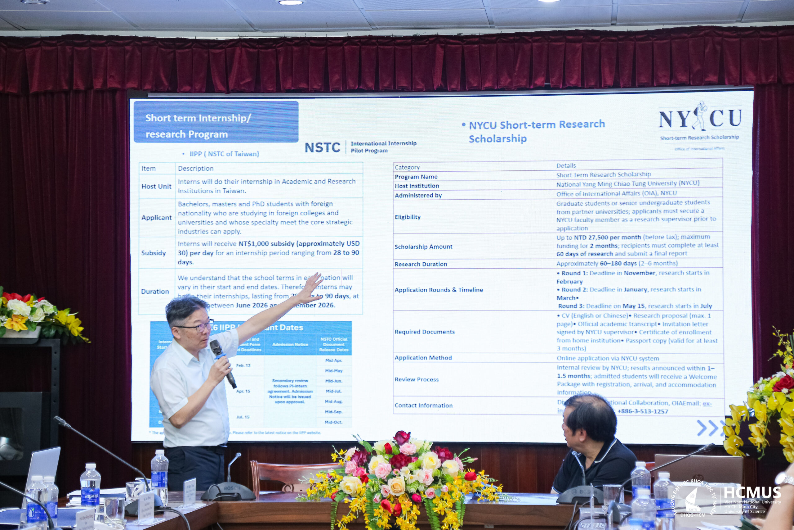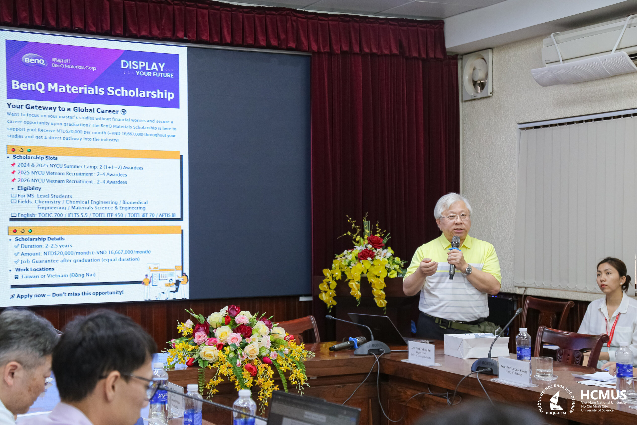 Trong phiên làm việc chính thức, hai bên tập trung trao đổi các định hướng hợp tác trong đào tạo, nghiên cứu khoa học và trao đổi học thuật. Đồng thời, phía NYCU giới thiệu tổng quan về các chương trình đào tạo, thế mạnh nghiên cứu và môi trường học tập tại Trường. Đặc biệt, đoàn NYCU đã trình bày chi tiết về chương trình BenQ Materials Scholarship – học bổng dành cho học viên cao học ngành Khoa học và Kỹ thuật Vật liệu tại NYCU, với mức hỗ trợ sinh hoạt phí 20.000 Đài tệ/tháng trong thời gian khoảng hai năm, kèm theo cơ hội làm việc tại Tập đoàn BenQ Materials (tại Đài Loan hoặc chi nhánh tại Việt Nam). Chương trình hướng đến các ứng viên có nền tảng nghiên cứu trong các lĩnh vực vật liệu y sinh và cảm biến, sản xuất bán dẫn, vật liệu polymer composite và các ngành liên quan như Hóa học, Kỹ thuật Hóa học, Kỹ thuật Y sinh, Khoa học và Kỹ thuật Vật liệu.