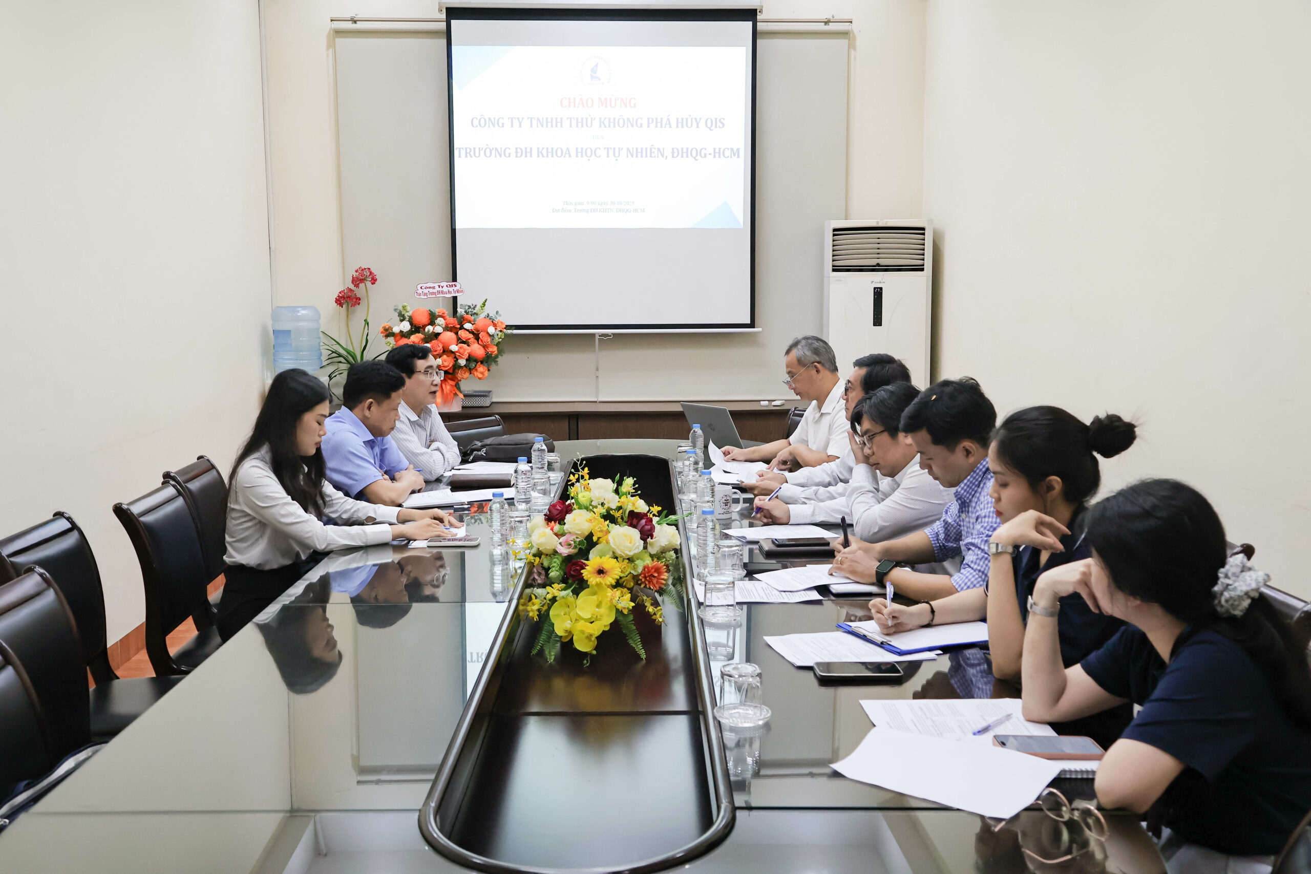 Tham dự buổi làm việc, về phía HCMUS có PGS. TS. Trần Lê Quan – Hiệu trưởng; TS. Võ Hồng Hải – Phó Trưởng Phòng Quan hệ đối ngoại; TS. Đặng Hoài Trung – Phó Trưởng Khoa Vật lý – Vật lý Kỹ thuật; TS. Phan Lê Hoàng Sang – Phó Trưởng Bộ môn Vật lý Hạt nhân, cùng các chuyên viên phụ trách công tác chuyên môn. Đại diện phía Công ty QIS gồm ông Nguyễn Phi Hùng – Giám đốc Ban Hành chính Nhân sự; ông Đinh Văn Ngư – Giám đốc Ban Trợ lý; và bà Trịnh Khánh Linh – Trợ lý Tổng Giám đốc.