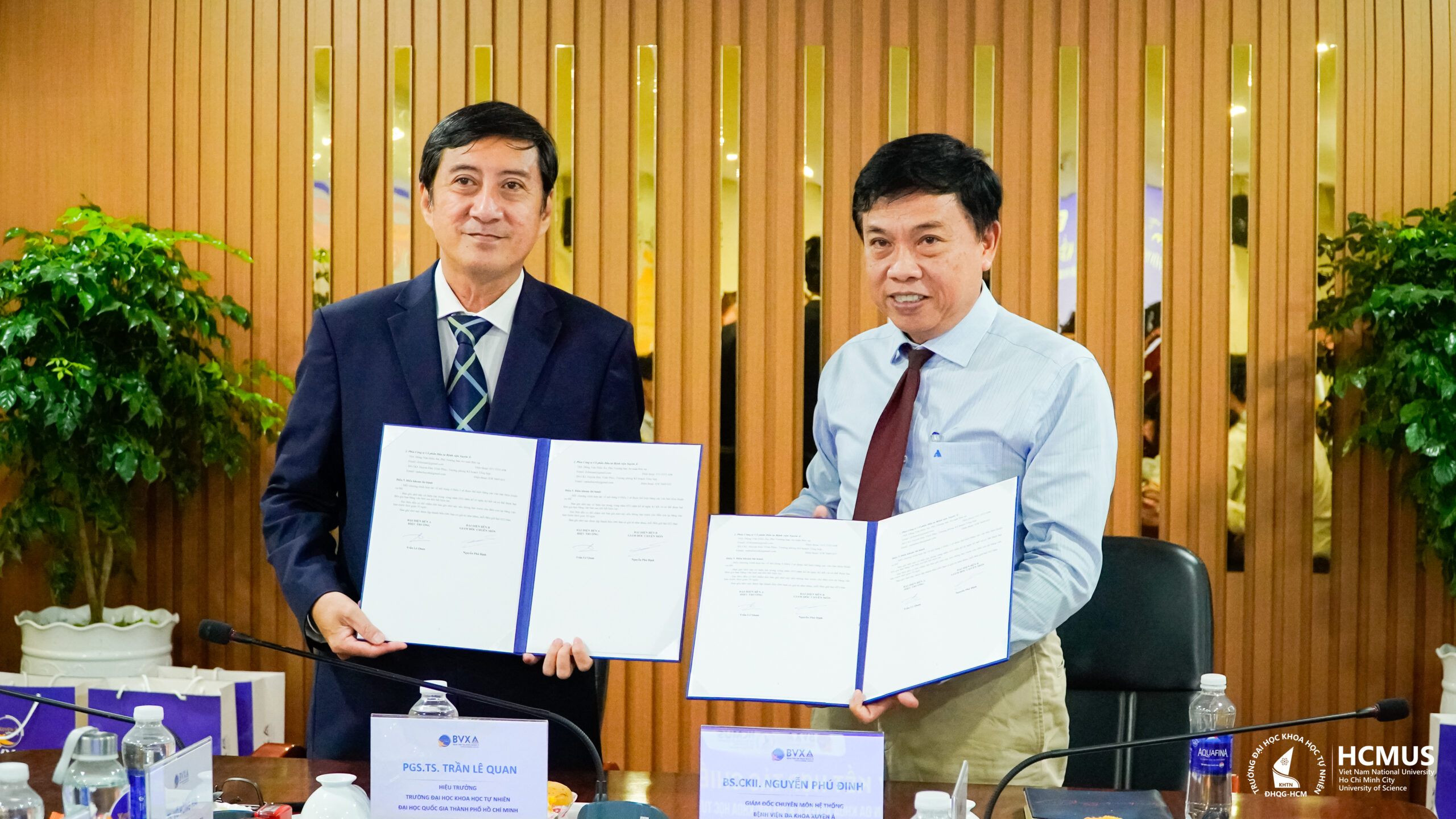PGS.TS. Trần Lê Quan – Hiệu trưởng Trường Đại học Khoa học tự nhiên, ĐHQG-HCM và BS.CKII. Nguyễn Phú Định – Giám đốc chuyên môn hệ thống BVXA ký kết Biên bản Ghi nhớ hợp tác.